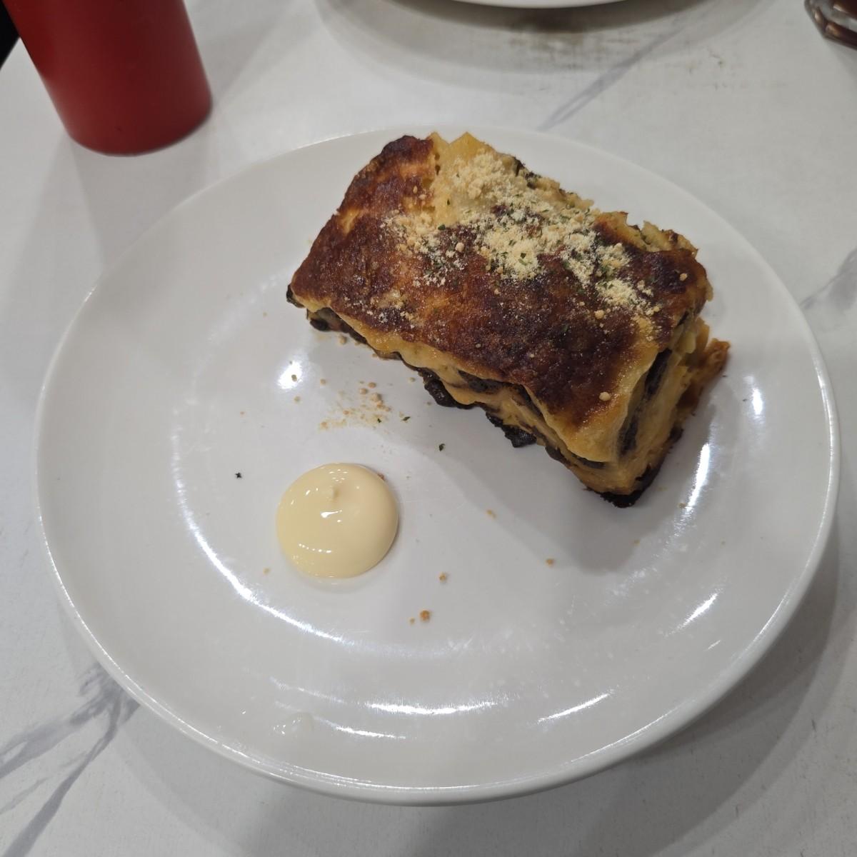 ラザニアの一切れは非常に厚みがあり、チーズとミートソースが満足感を与えてくれます。食べるととても繊細な感じがします。