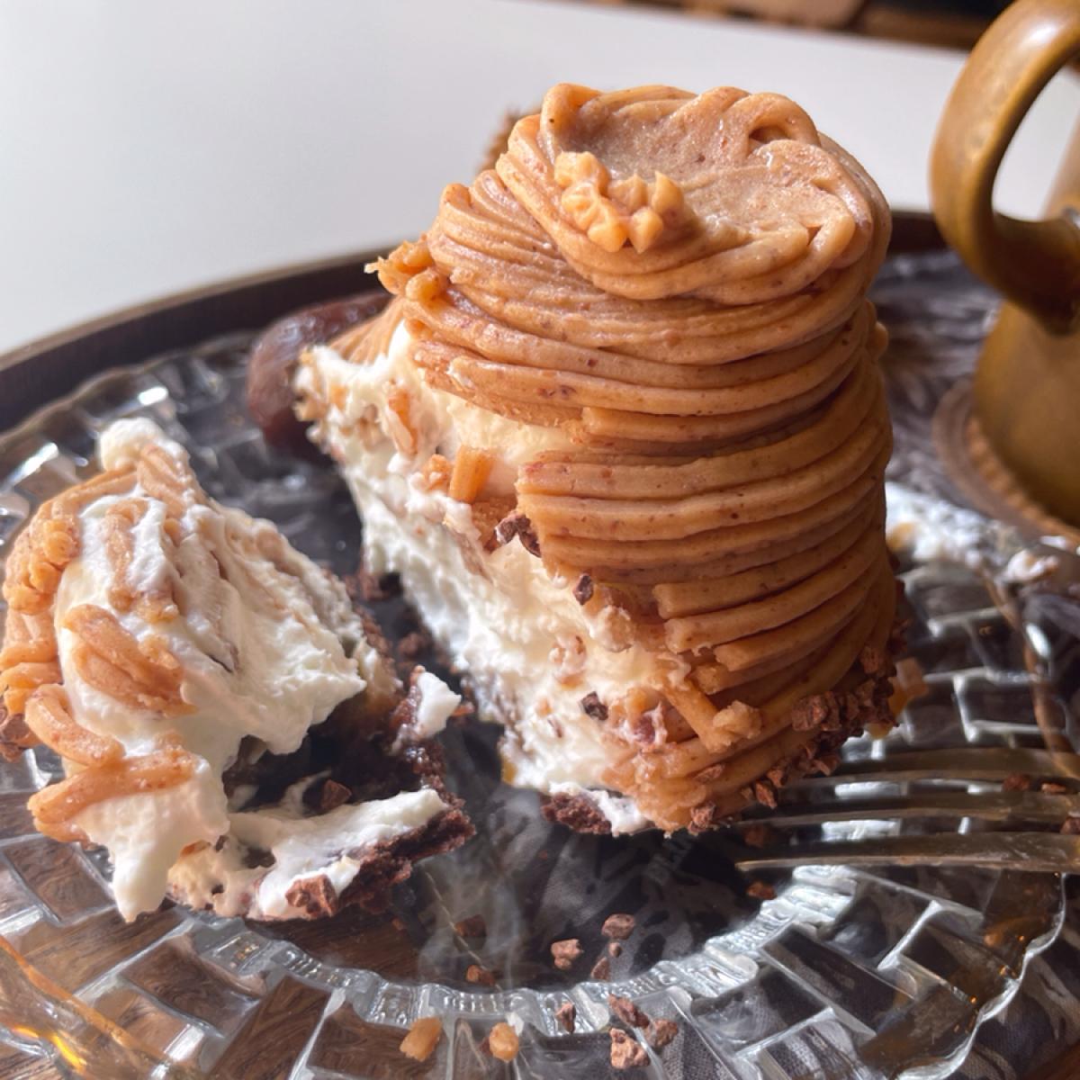 普段あまりデザートを食べない私も、温かい雰囲気に惹かれ、季節限定の栗のモンブランを注文しました!外側の栗のペーストは濃厚で、中の生クリームは甘すぎず、最内層には数粒の栗がしっかり入っています🌰!柔らかくないタイプの栗で、全体に少しの食感を加えています!タルト生地はチョコレート製で、そこに振りかけられたチョコレートの砕いたものがほろ苦さをプラスしています~バランス感が素晴らしいデザートです!