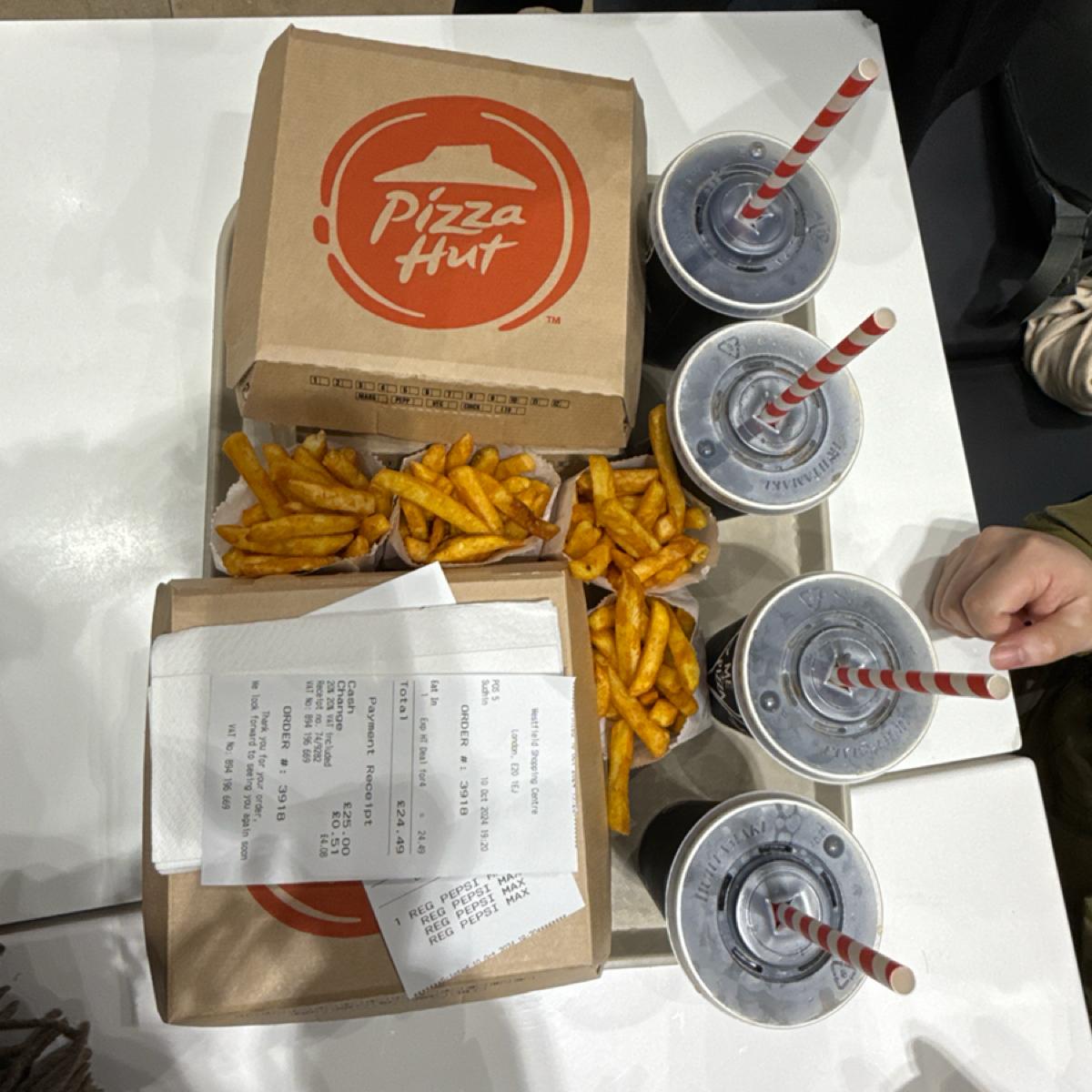 今日はオックスフォード大学を見学した帰り道です。ホテルの近くにはあまり選択肢がなかったので、デパート地下のフードコートにあるピザハットを食べることに決めました。台湾のピザハットとは違って、これはエクスプレススタイルで、個人セットメニューになっています。個人用のピザ、個人用のフライドポテト、そして一人に一杯の飲み物が付きます。ちょうど4種類のセットメニューを見かけたので、値段を考えるととてもお得で、これを夕食にすることに決定しました。