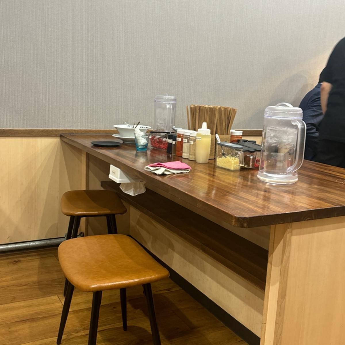 店内には約10席ほどで、カウンター席とテーブル席が半々です。テーブルには多様な調味料があり、にんにくや紅しょうがなどのトッピングもあり、飽きてきた時に味を変えることができます。