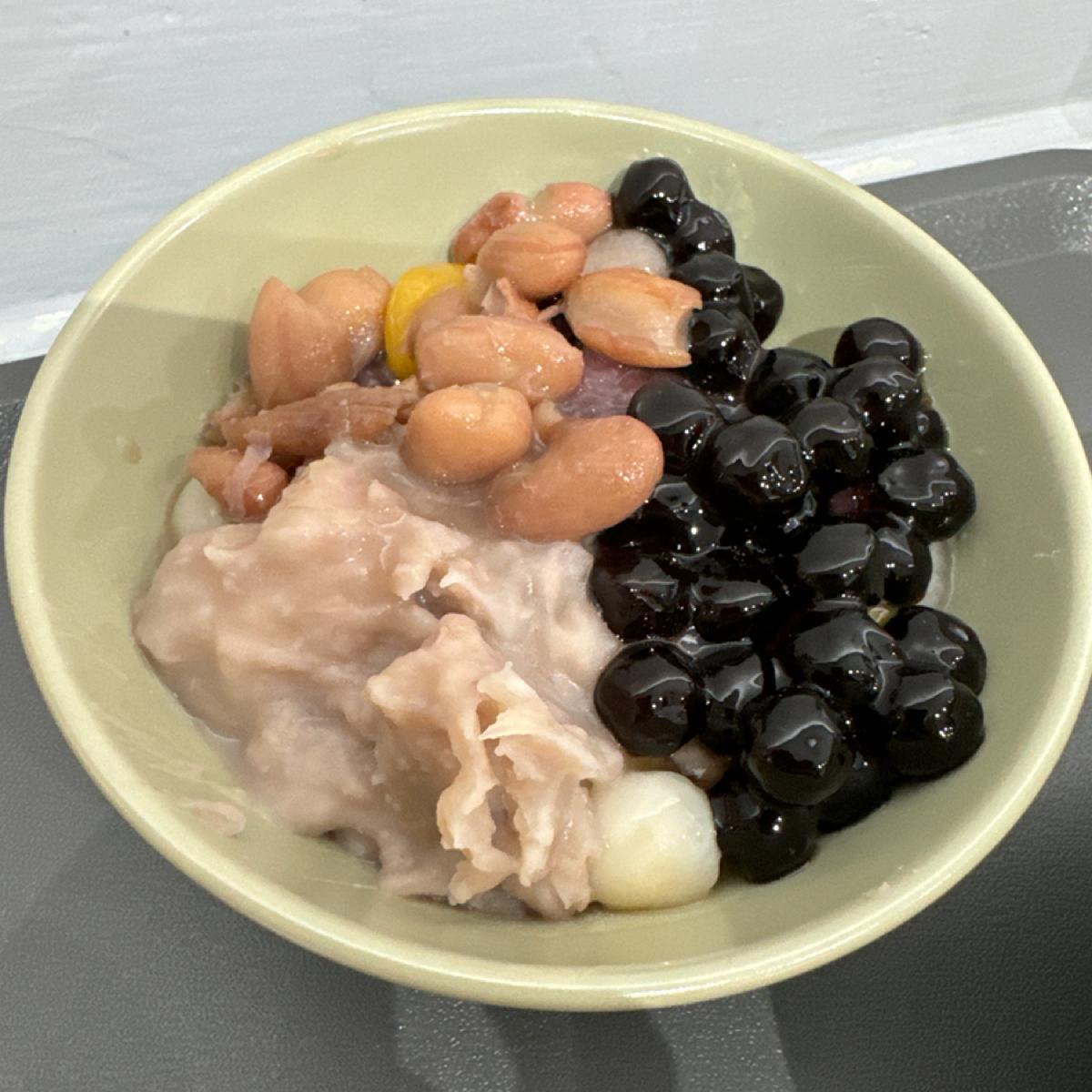 -ぜんざい-ぜんざいの甘さは3〜4くらいで、粒状の小豆が少し入っています。材料は基本的に甘すぎません。それぞれの食材のQ度が違うので、味わいが豊かになります。その真珠はとてもQです。個人的には紫芋玉が一番好きですが、里芋玉やさつまいも玉に比べると本来の風味が感じられません。里芋は丸ごとピューレ状に煮たもので甘すぎません。