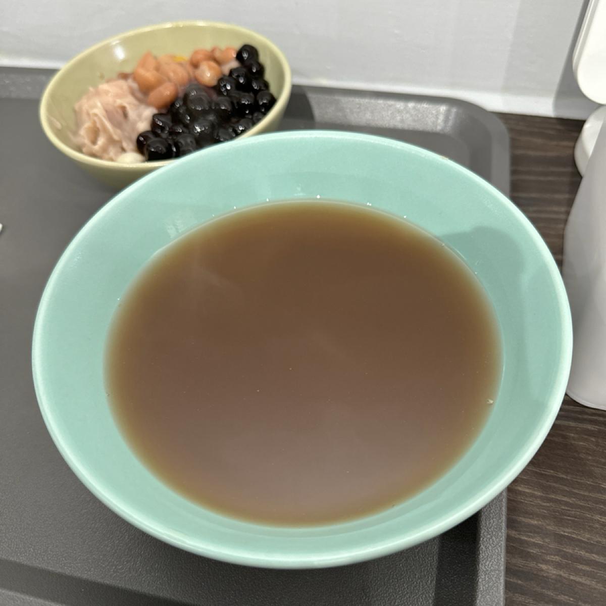 丼一杯80。具材は全て固定です。 タロイモボール/サツマイモボール/紫イモボール/パール/QQボール/紅白もちむすび/タロイモ/ピント豆です。 スープのベースが異なります。