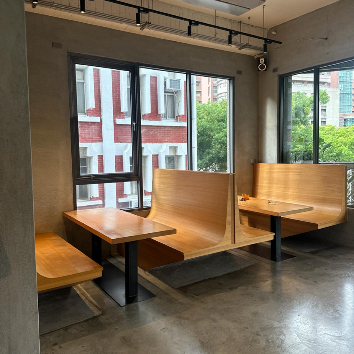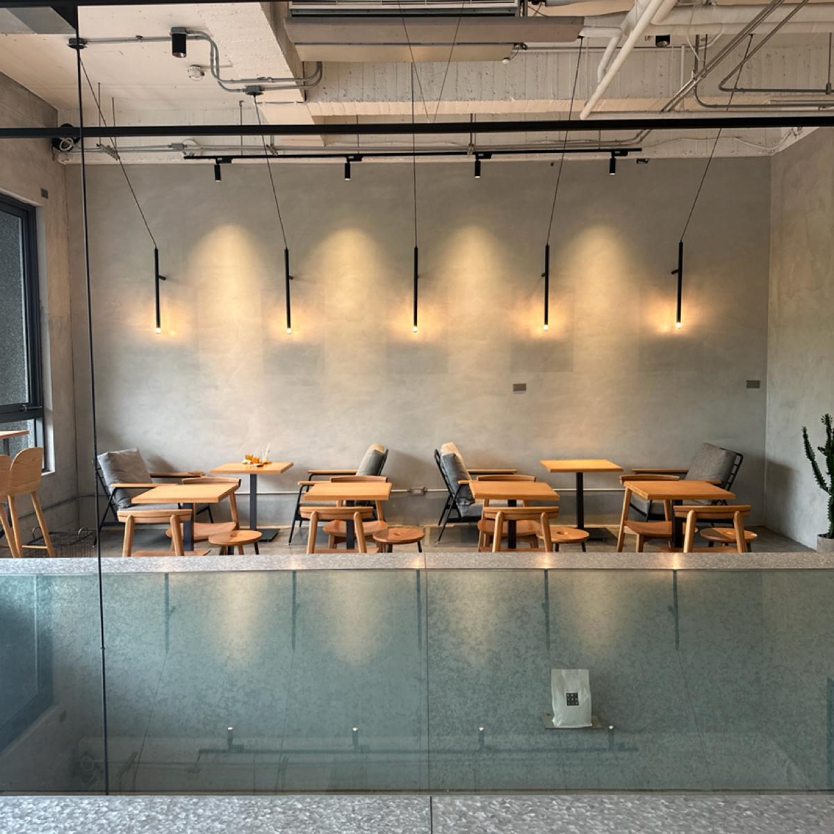 飲んでBottoms Upはシンプルなコンクリートテイストで、大きな面積の床から天井までのガラスの店構え。1階の窓際にはハイチェアーの座席エリアがあり、電源も提供されています。椅子とテーブルの高さは本当に快適で、数枚の二人掛けテーブルと椅子もあります。2階の中庭には食事用テーブルエリアがあり、左側には4人用テーブルの個室エリア、窓際のハイチェアや右側のソファエリアには電源があり、大きなガラスデザインは本当に快適な採光を提供しています。雨の日もまた特別な雰囲気があり、全体の空間は快適で広々としています。