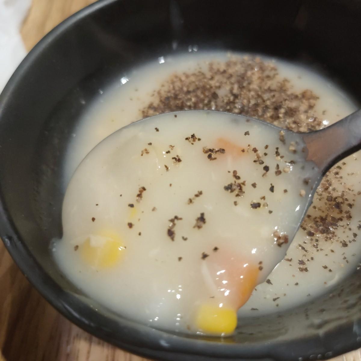 コーンチャウダー:濃厚で具材がとっても柔らかく、ひと吹きで濃厚な食感に変わります。