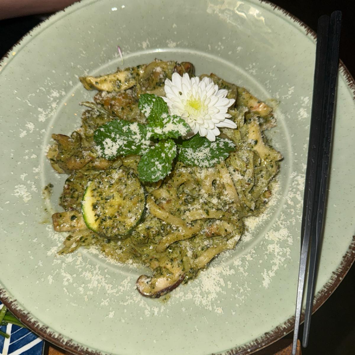 イタリアンな濃厚な青ソースではなく、台湾風と日本風がミックスされた感覚:バジルの香り、クリーミーさ、鶏肉の柔らかさ、うどんの弾力があります。濃厚な味わいながらも飽きが来ず、賑やかな串焼きの後の柔らかい結末です。