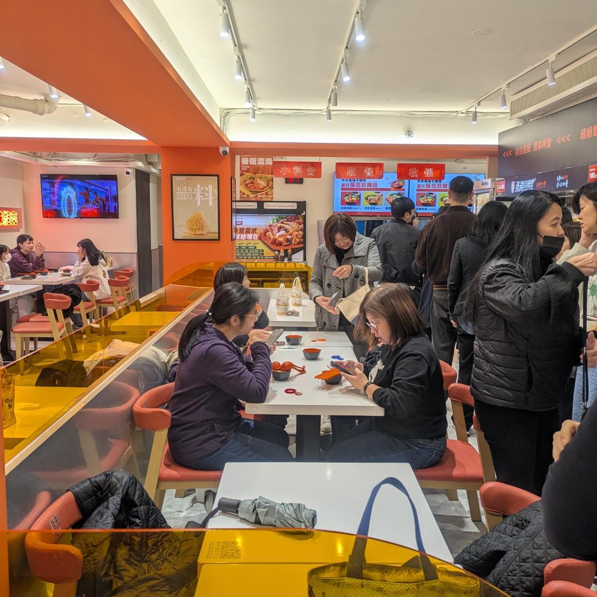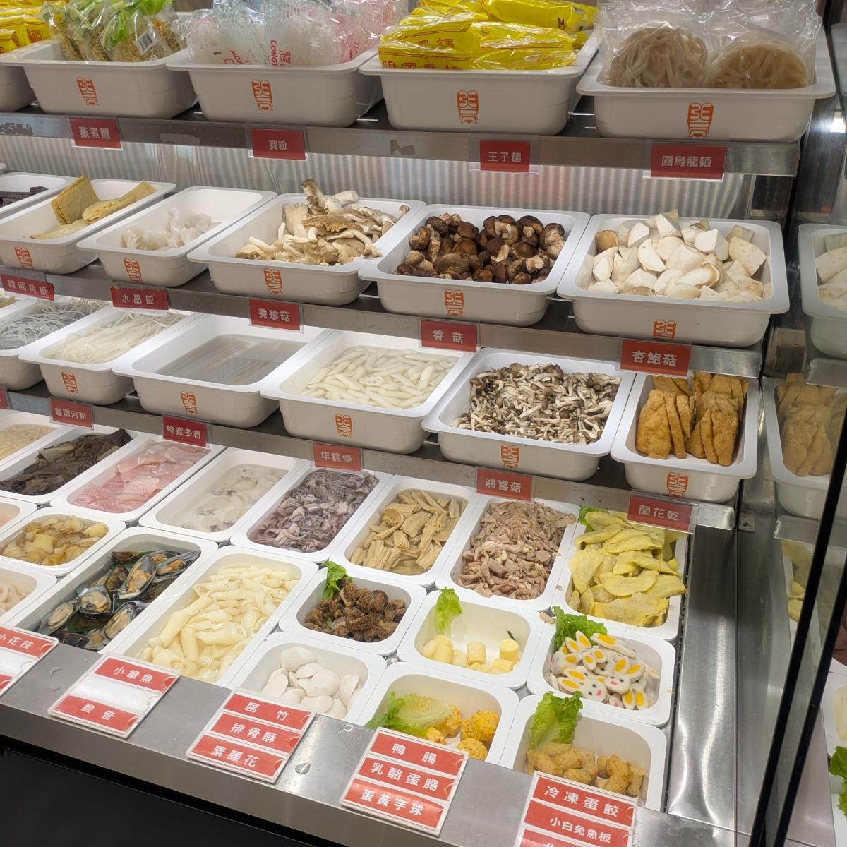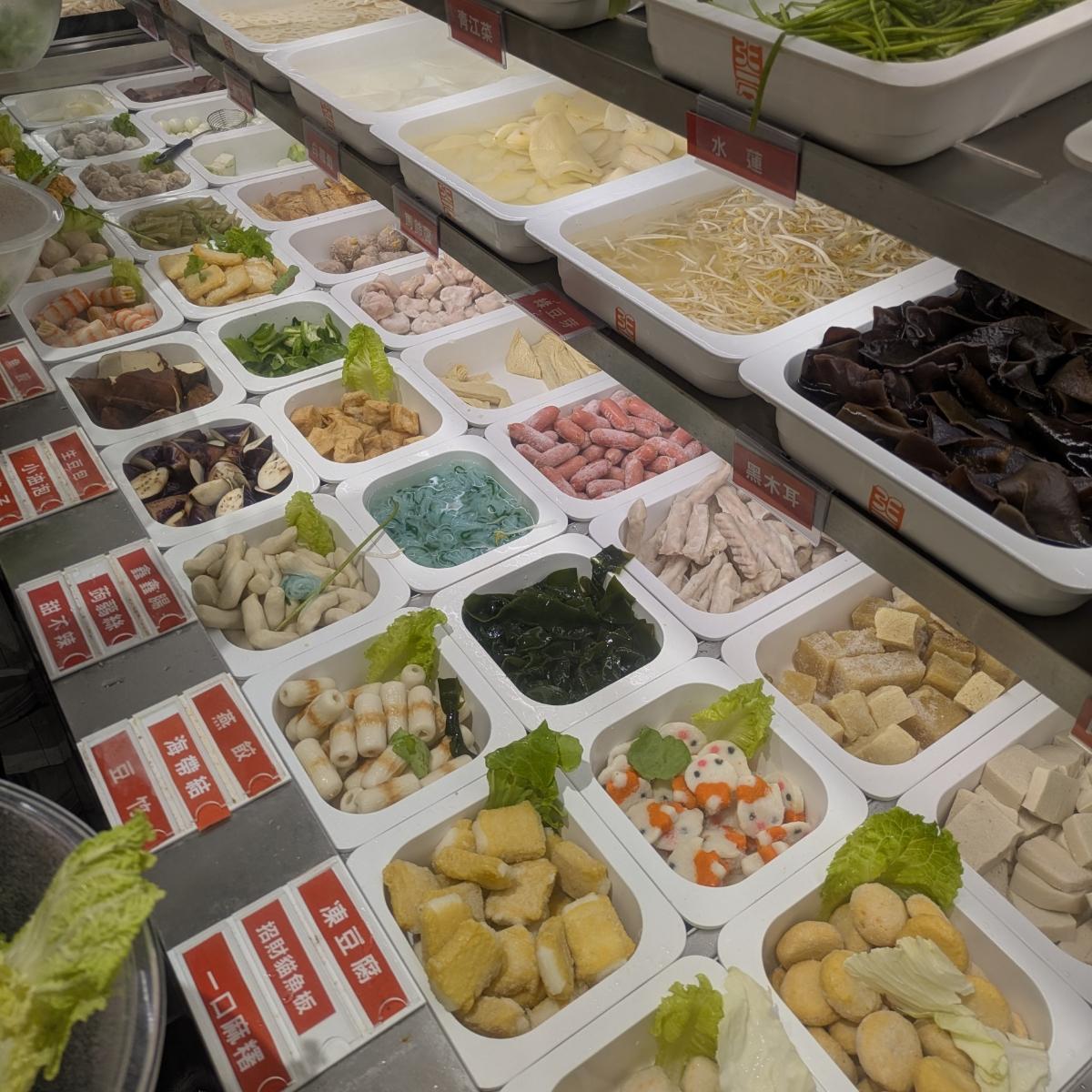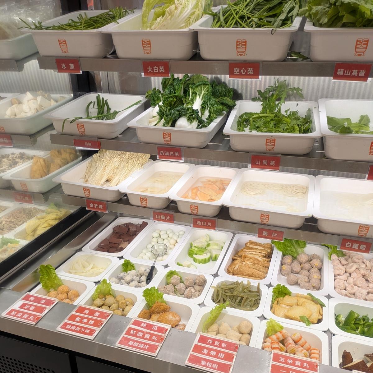 入店後は自分で座席を見つけ、右側で大きなボウルとトングを取って好きな食材を選ぶために並びます。前方は野菜や火鍋の材料が中心で、後方はきのこや澱粉、肉類となっています。選び終えたら、カウンターで計量して番号札を取ります。価格は49元/100グラムです。(麺/ご飯は20元)現金とクレジットカードで支払い可能で、請求書に載せることができ、サービス料はありません。