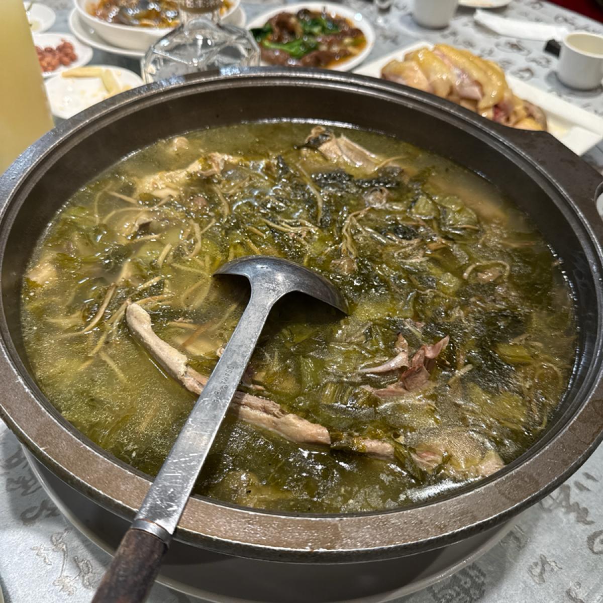 スープ《酸菜と肥鴨の煮込み》はテーブルのハイライトの一つです。スープは酸味と香りが口に優しく、肥鴨は柔らかくてスムーズで、酸菜が油の感じを見事にバランスをとっていて、もっと飲みたくなる暖かいスープです。