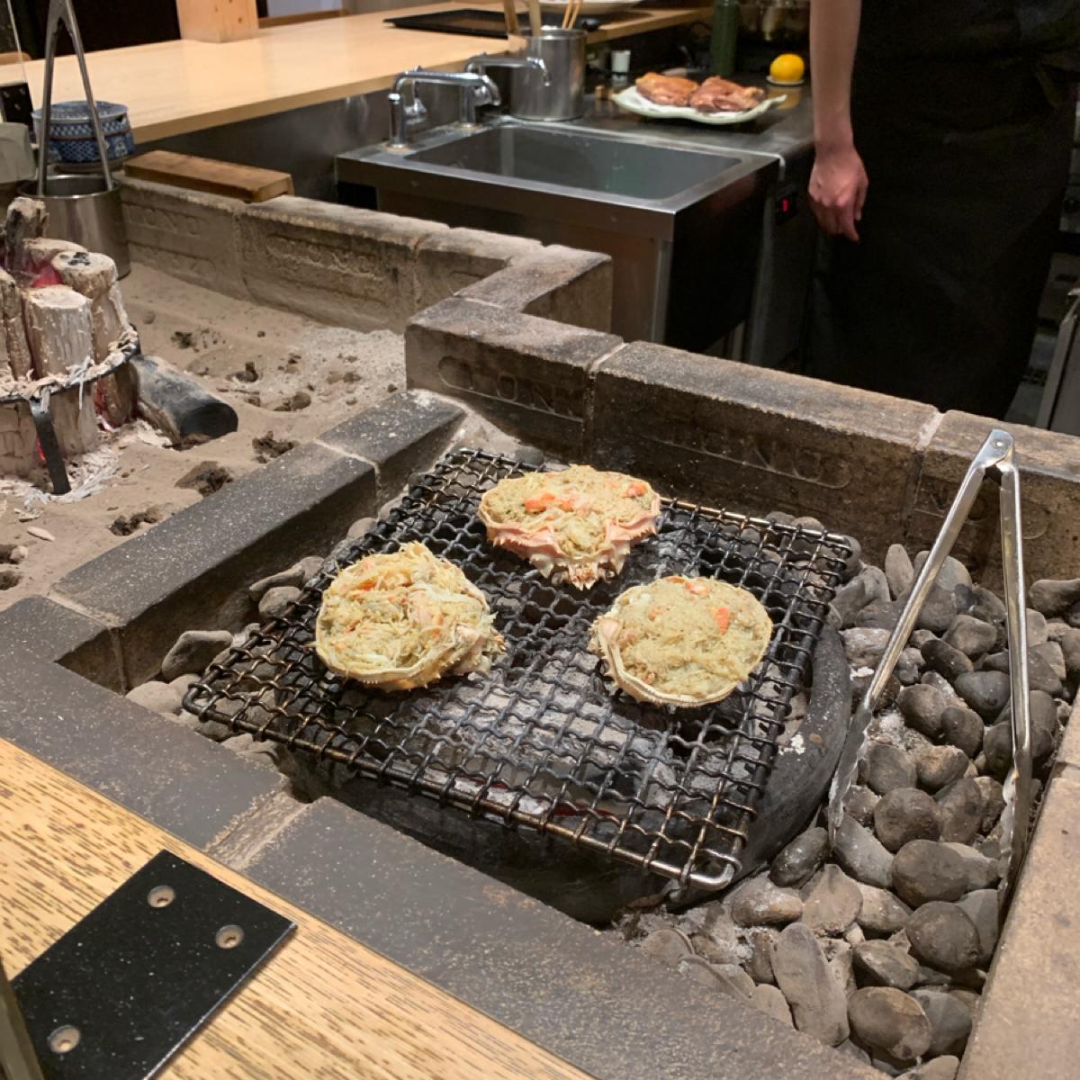 蟹を殻で焼いて