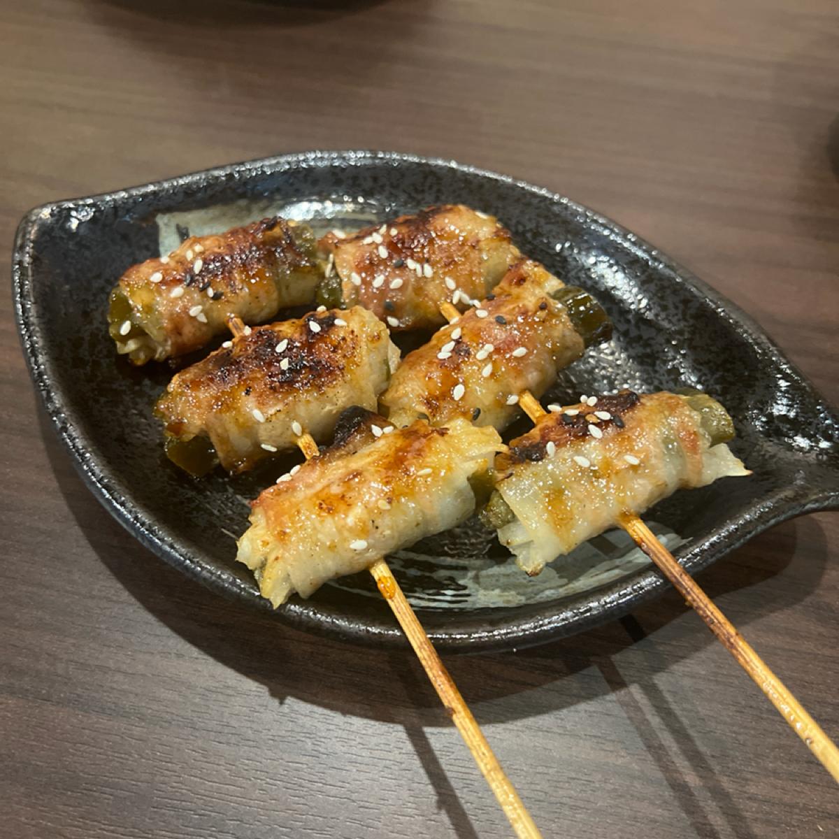 剥き皮の辛椒豚肉巻きの串2本$140(味がかなり特別です)