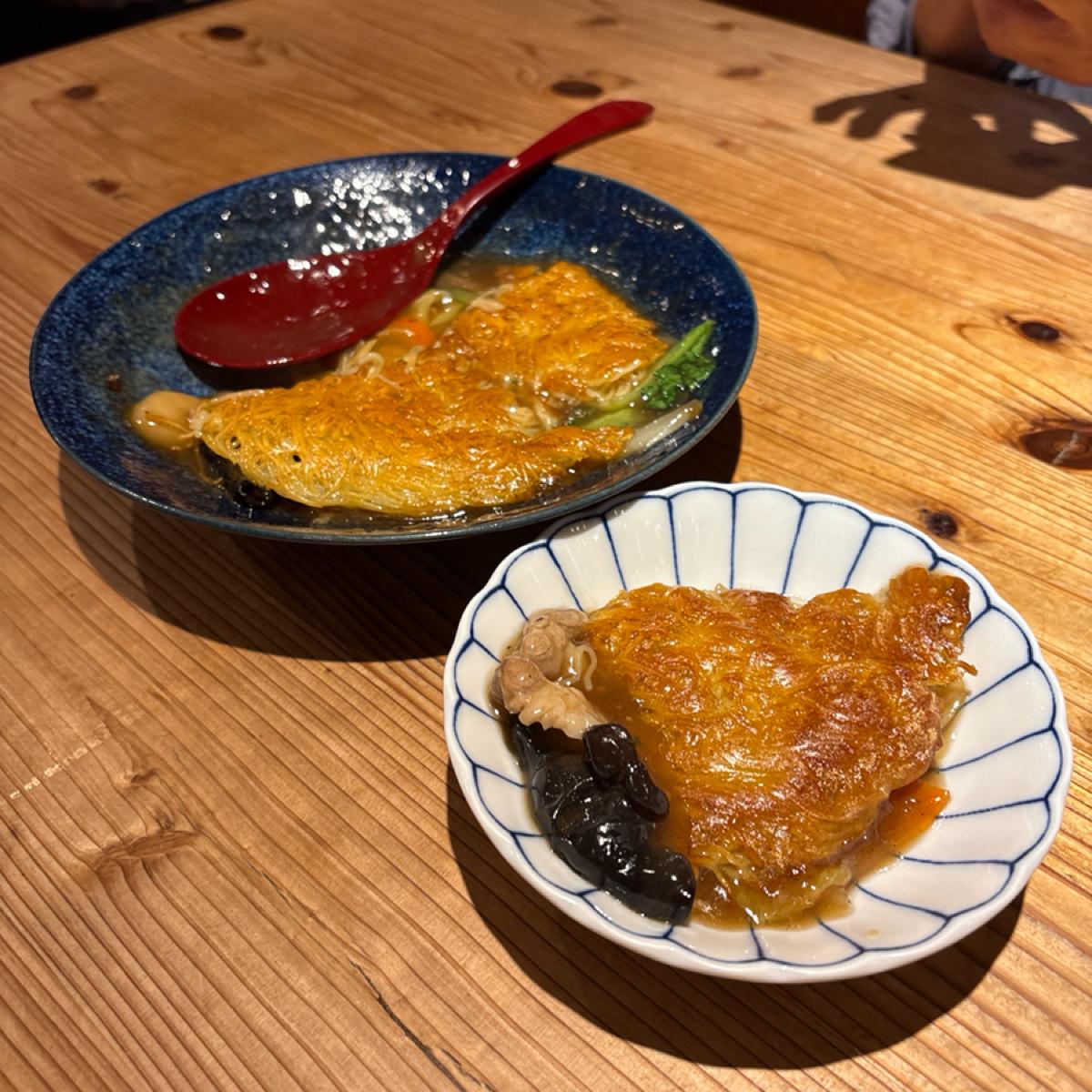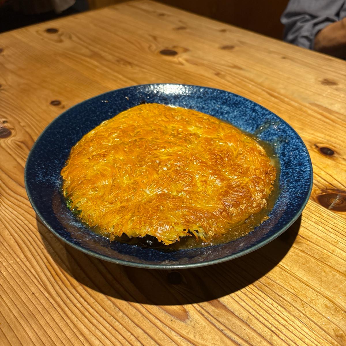 極細の卵麺を蒸し焼きにして、片面だけをバリッと焼き上げその下に具沢山の餡が入った麺料理です。