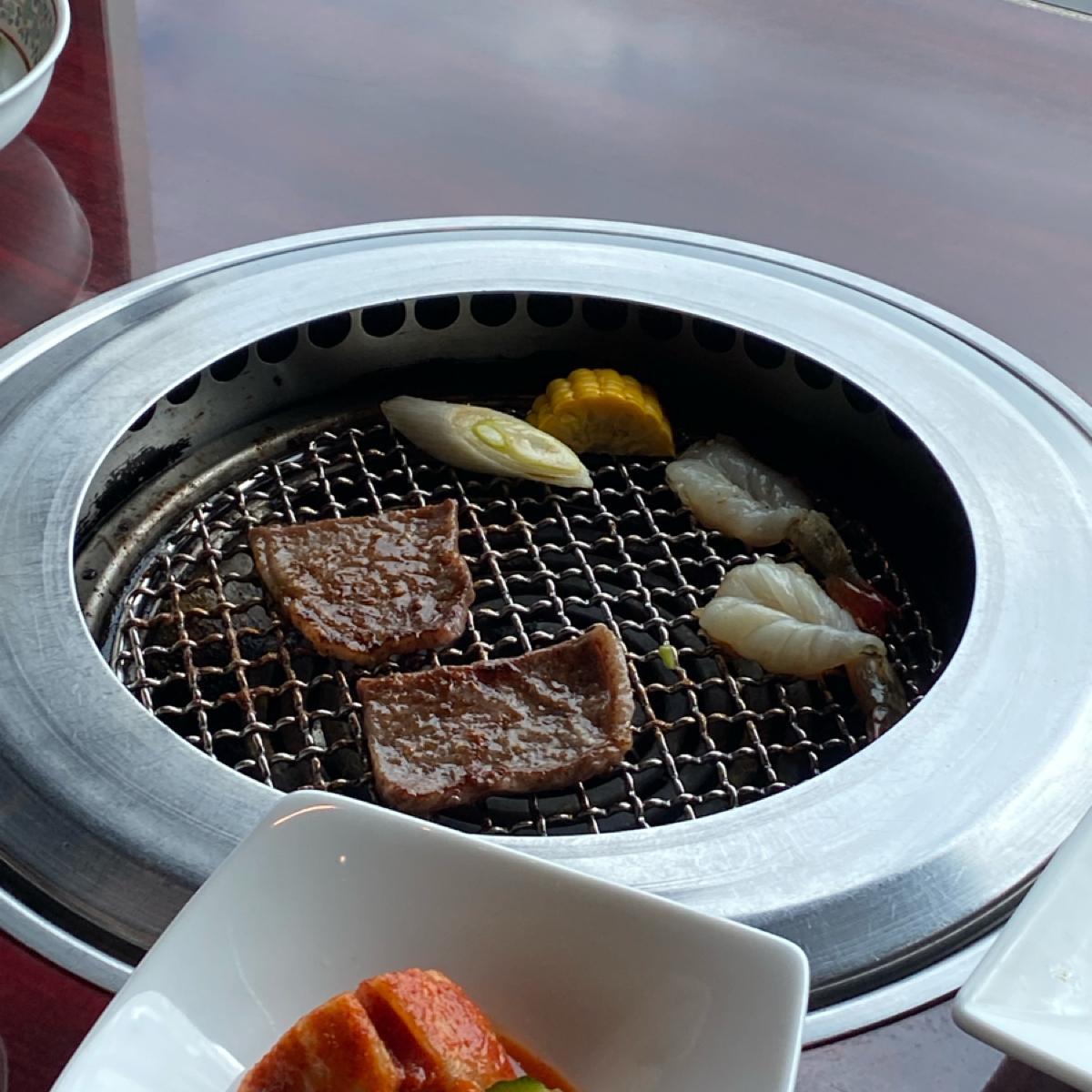 ·メニューには記載されている肉類の料理[上等牛脊肉、牛バラ肉、新鮮エビ]、キムチ盛り合わせ、サラダ、韓国風和え物、ご飯、スープ、デザート、ランチセット飲み物(コーヒー、ウーロン茶またはカルピス)