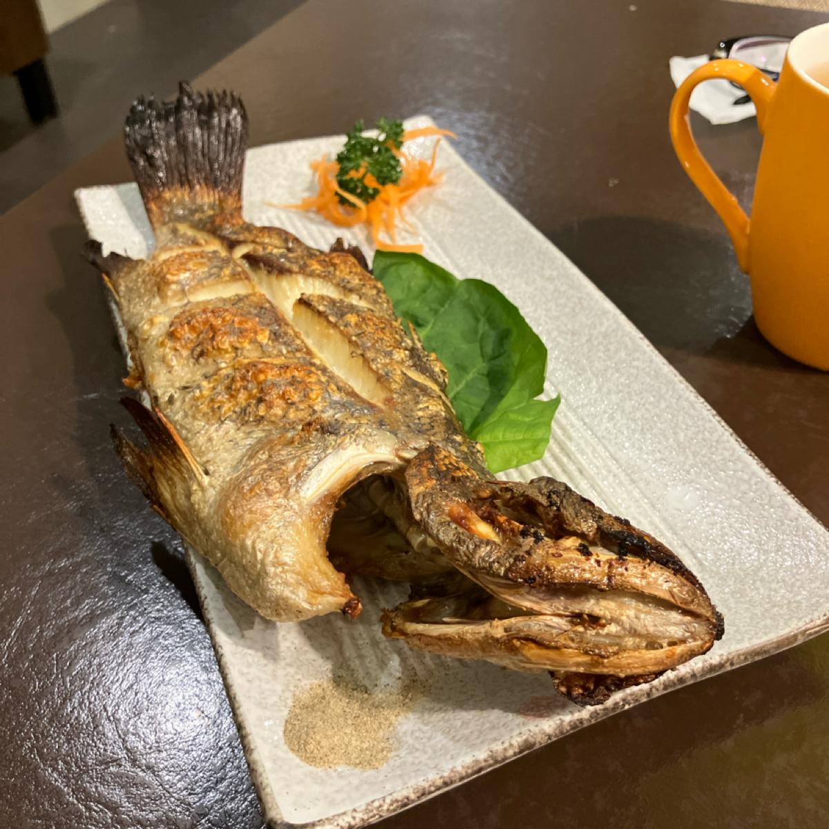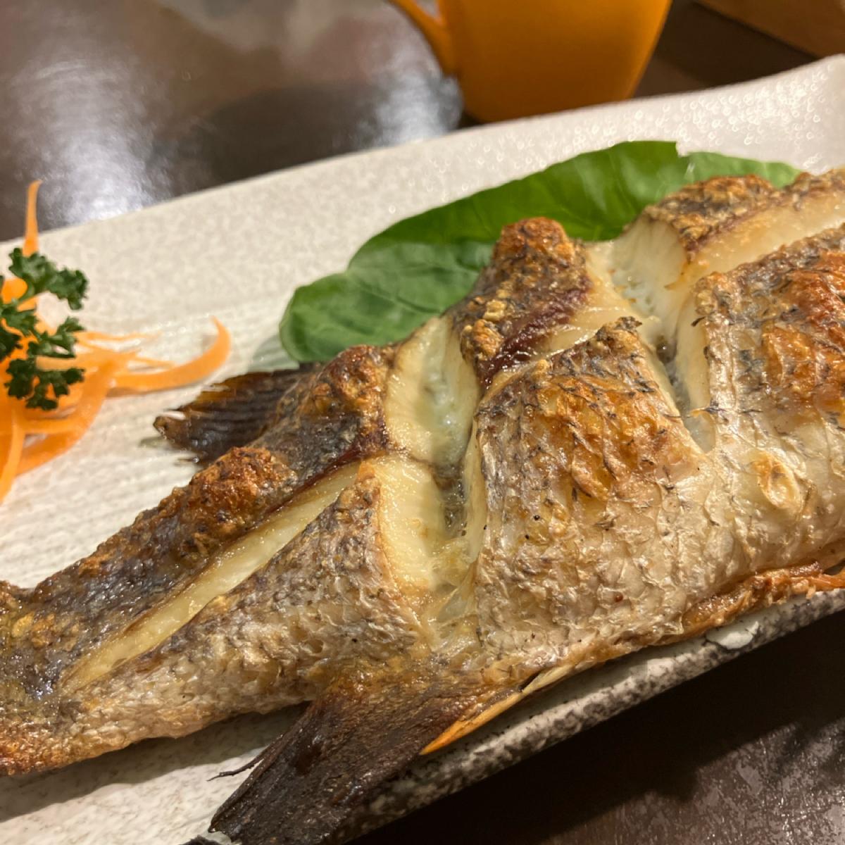 主食の魚はとても大きく、家で二人で食べられるくらいの大きさで、焼き加減がとても良く、皮はパリパリ、身は柔らかくてジューシーです。獲れたての魚を焼きたてで提供します。