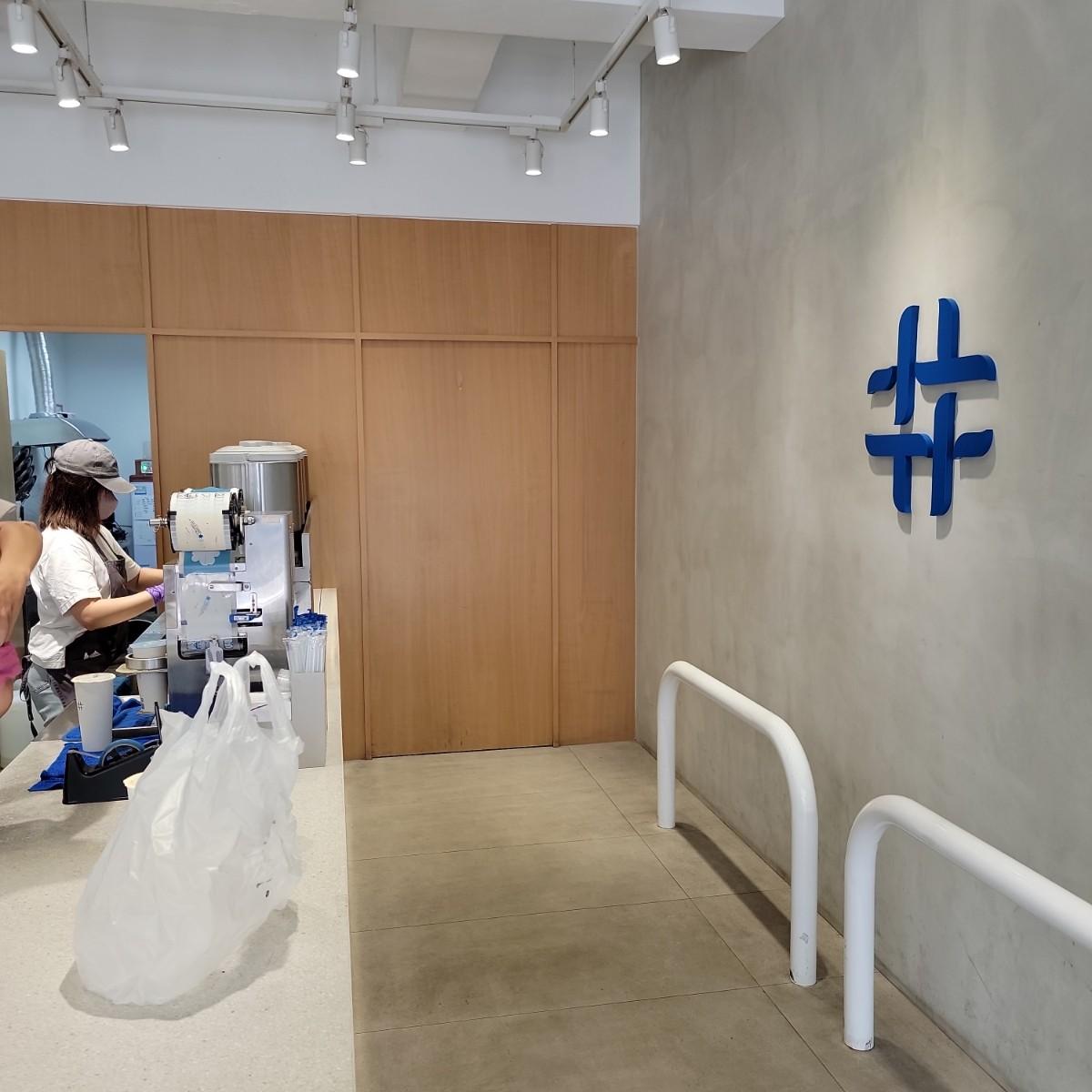 得正のスタイルは、遠くからも見える#の看板が特徴的で、装飾はシンプルな青と白の組み合わせです。内部には写真を撮るためのインスタ映えする壁もあります。