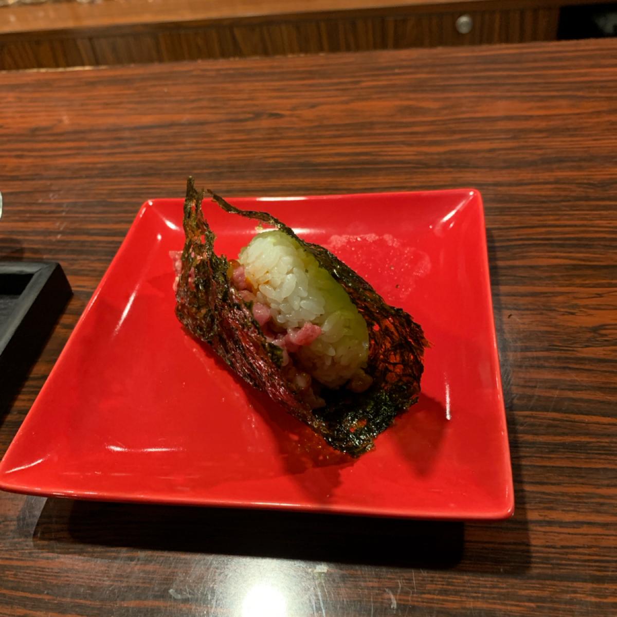 大きな韓国海苔におにぎりとユッケといくらが乗ってました✨