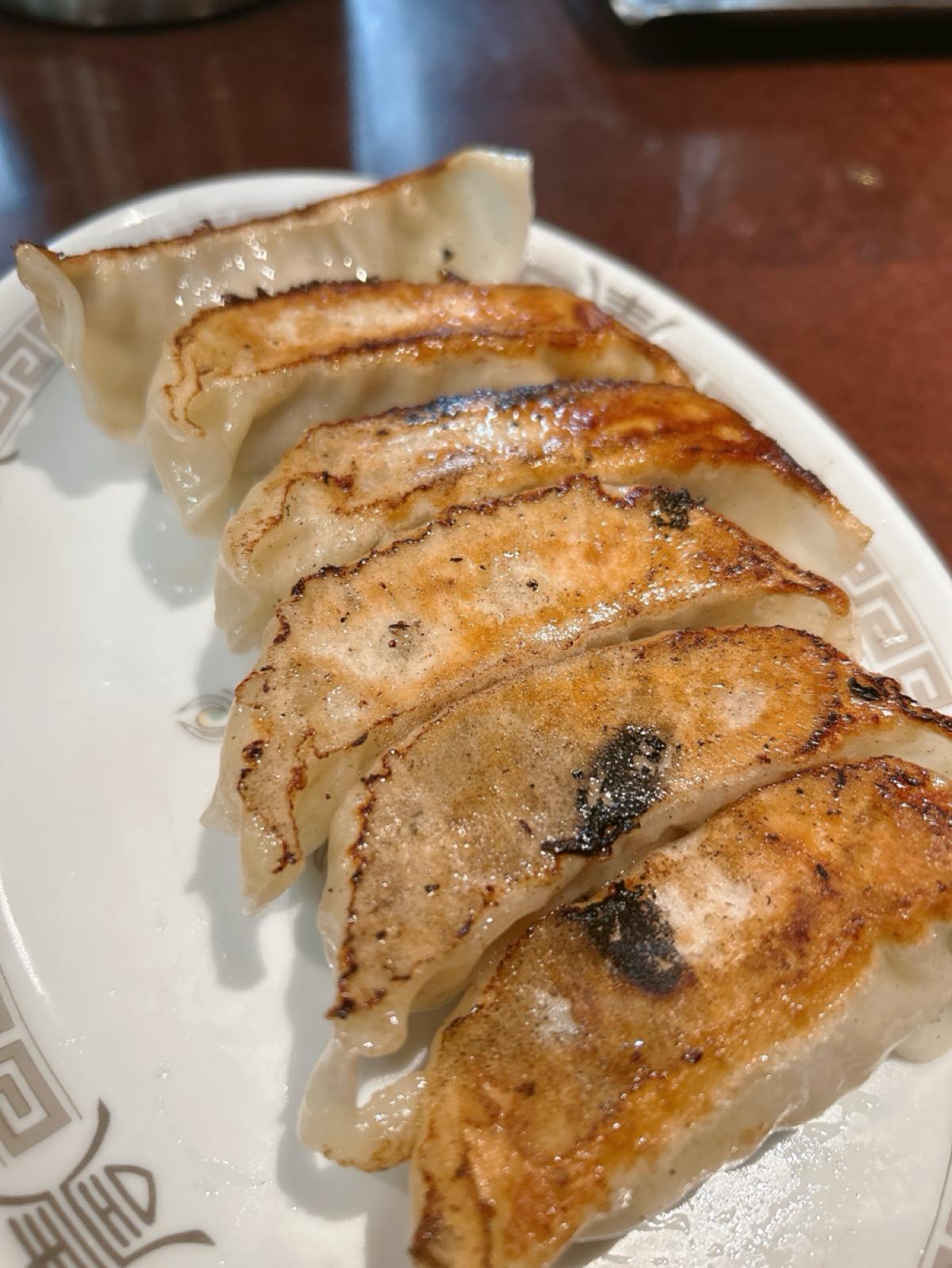 ◉餃子。¥900。見た目・味:6個入りで大きい。シンプルな味付けであっさりしていて生地はモチモチで食べやすい。ハーフ3個も対応可能なので大きく心配な人はハーフでも良い。