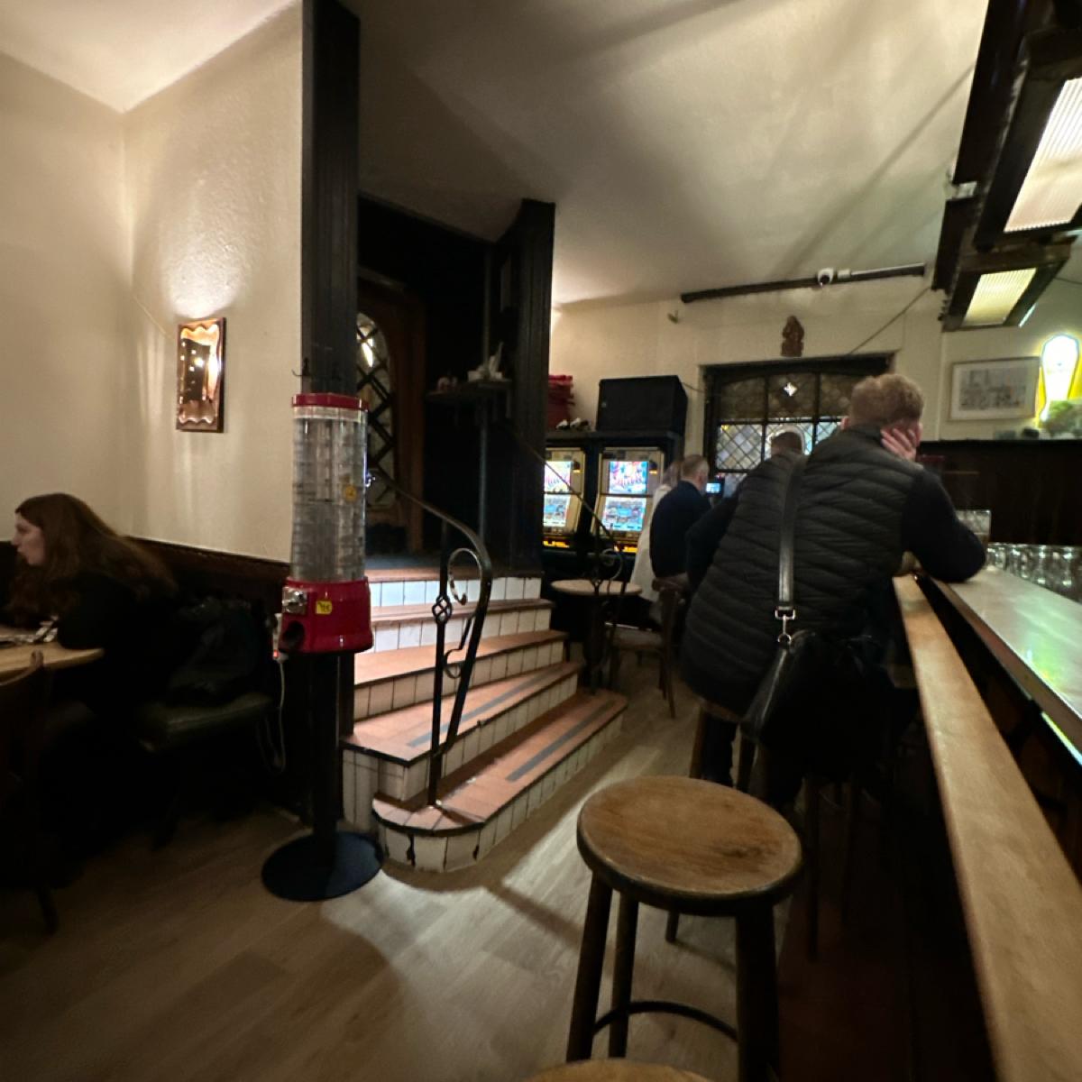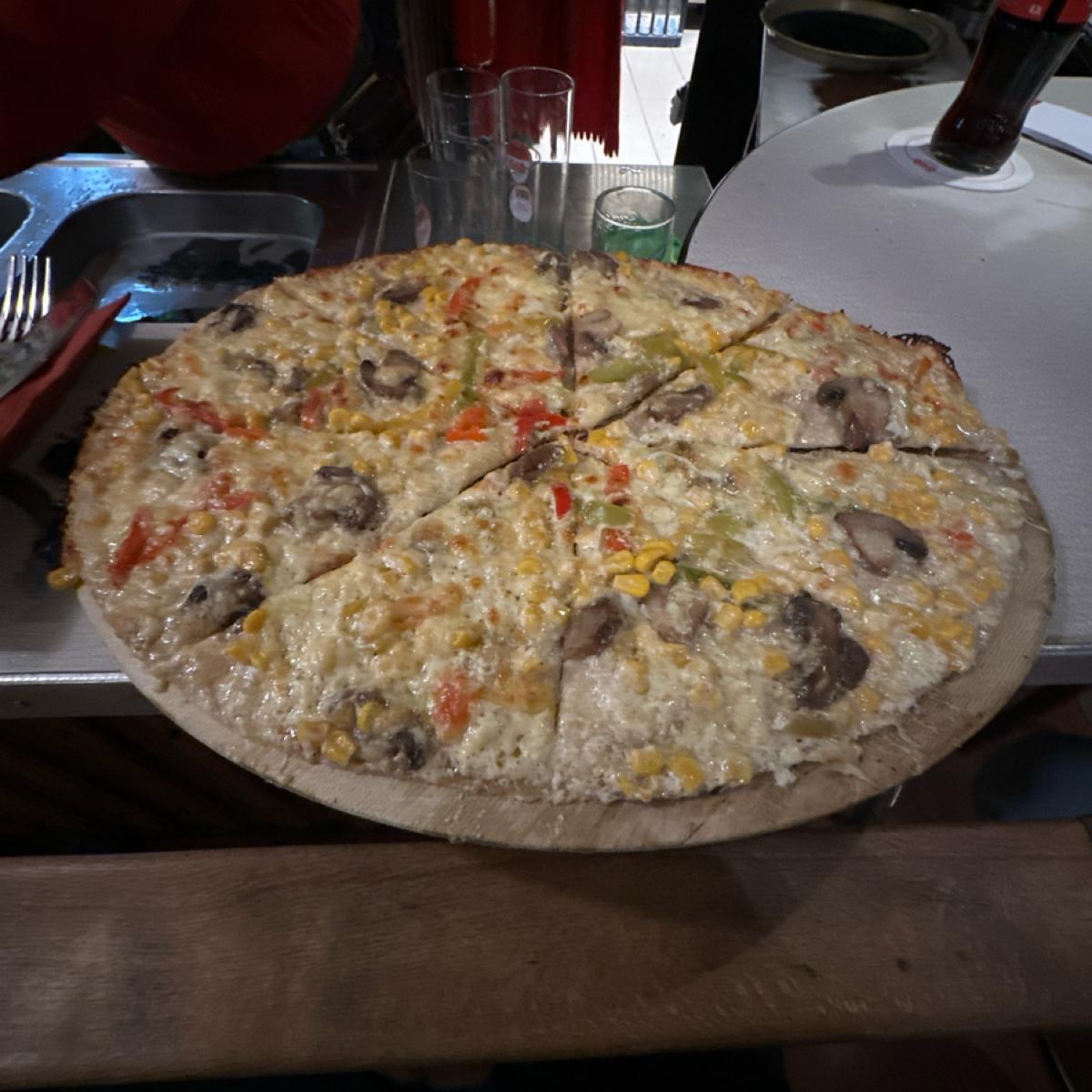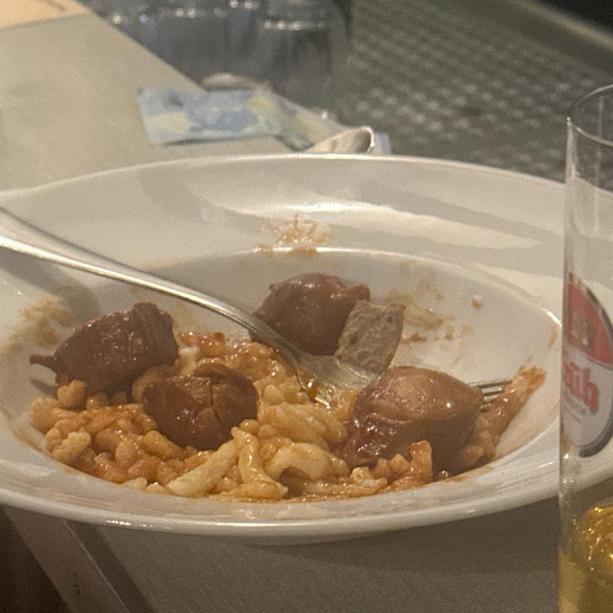 これは、フレンドリーな人々がいる小さな家族経営の地元のバーです。すべてが小さな工房の特徴です。ビールは大・小のカップがあり、小カップは鮮度を保つため本格派、大カップは観光客向け。注文したピザは、見た目はちょっと貧相ですが、味はモチモチでとても美味しかったです!