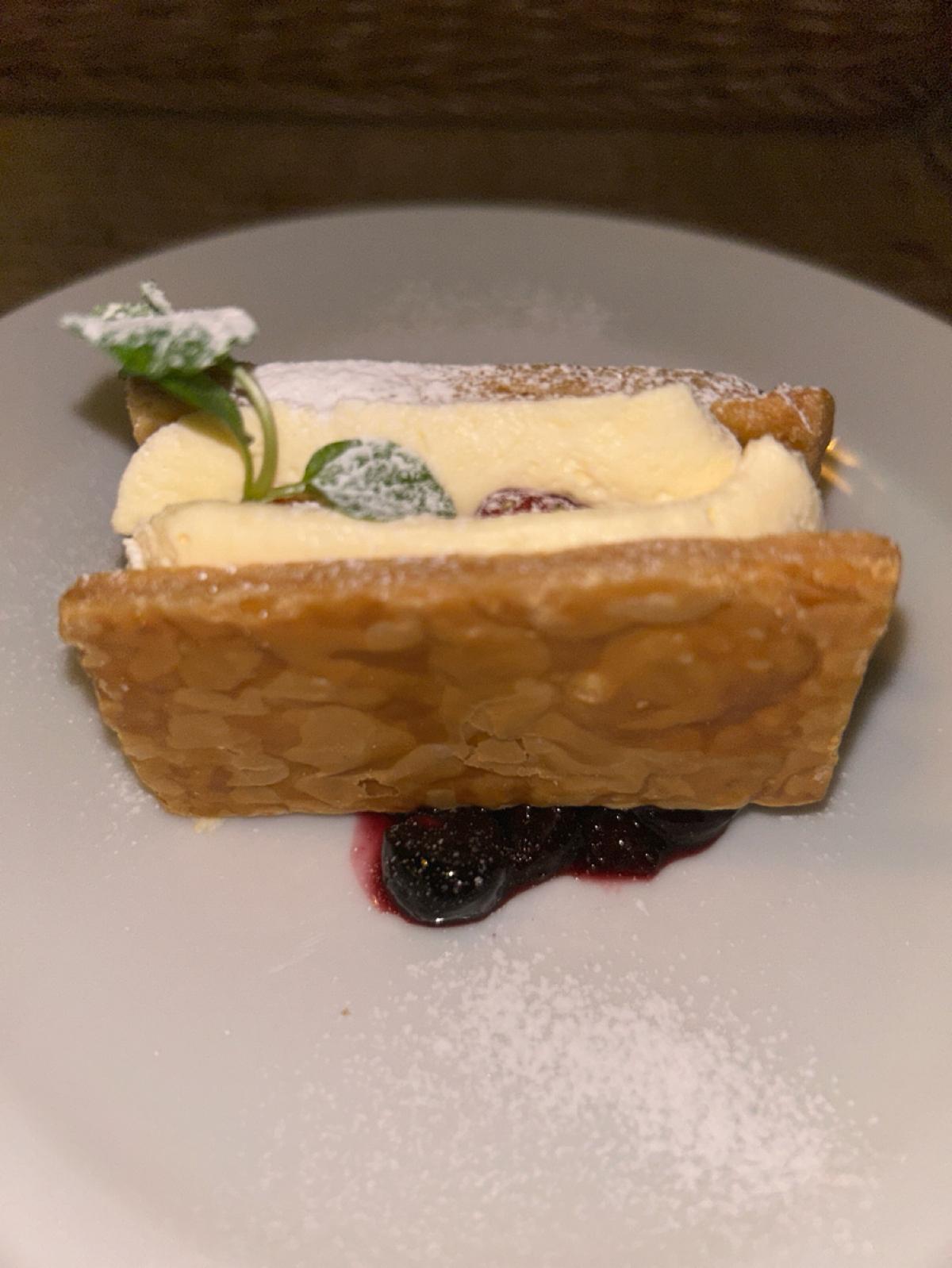 ミルトベリーソース。見た目・味:薄いパイ生地にクリームがたっぷり入ってベリーソースの甘さが際立つ。