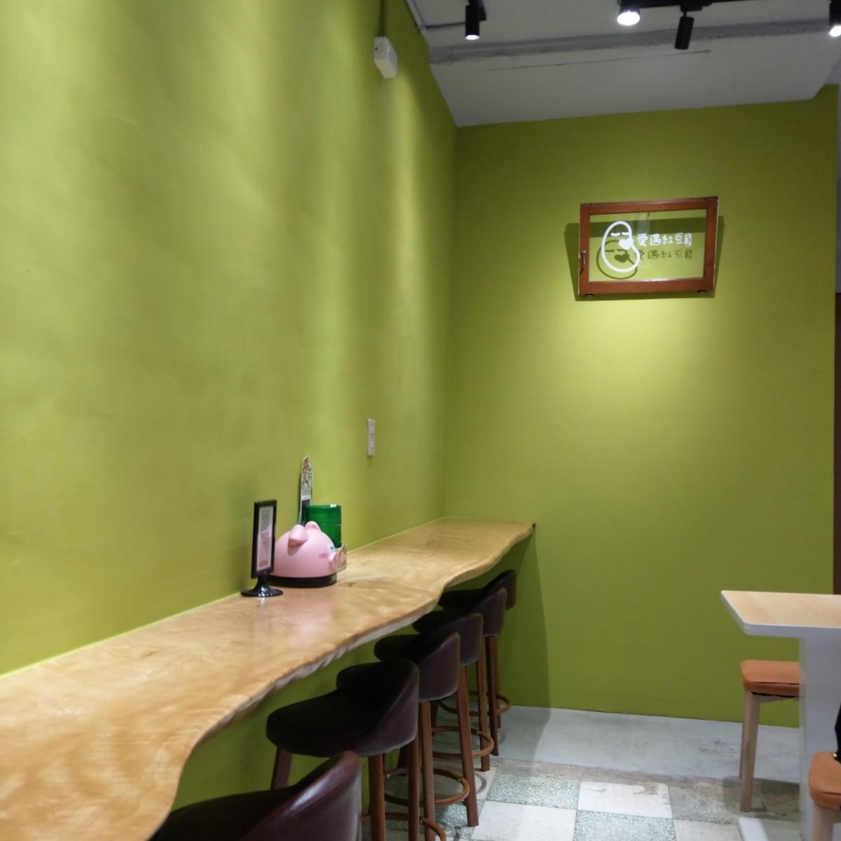 愛遇紅豆は新店市エリアにあり、最寄りの地下鉄駅は七張駅1番出口で、徒歩約2分の場所にあります。2023年7月に新しくオープンした店で、装飾もまだ新しく、木製のフレームと白い壁、目を引く赤いロゴ(1つの赤い豆?)を備えた外観をしています。店内の座席エリアにはデザインされた木製のテーブルがあり、壁はアボカドグリーンで塗装されており、自家製のジャーキー(ブランド:一片肉乾)が飾られた壁もあります。カウンターには小さな白いモザイクタイルが貼られ、全体の配置はとても心を込めており、空間が広く、環境は清潔で快適です。