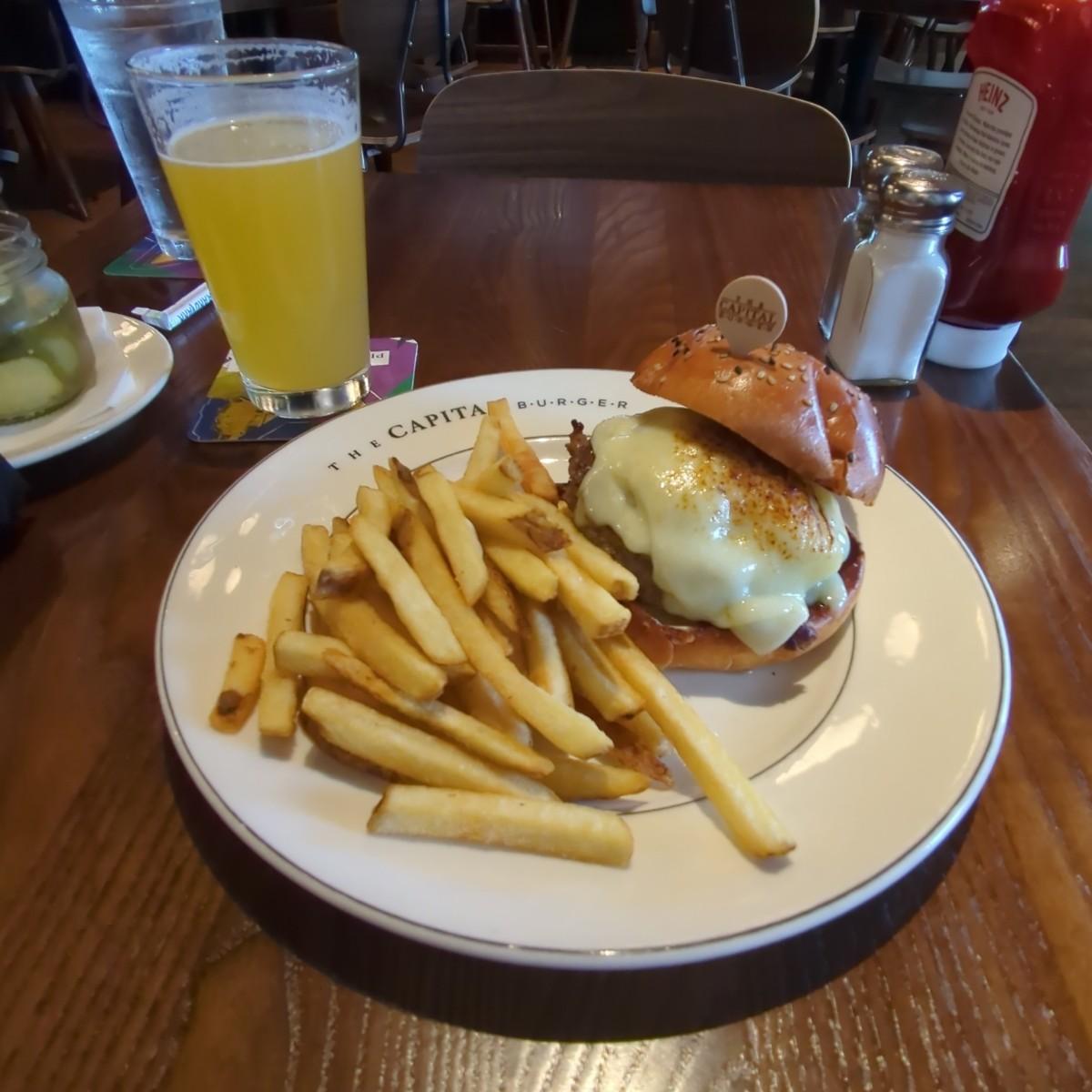 私はキャピタルバーガーを頼みましたが、キャラメリゼされた玉ねぎ、ウィスコンシン・グランクリュ・グリュイエールチーズ、シャロットアイオリがトッピングされています。