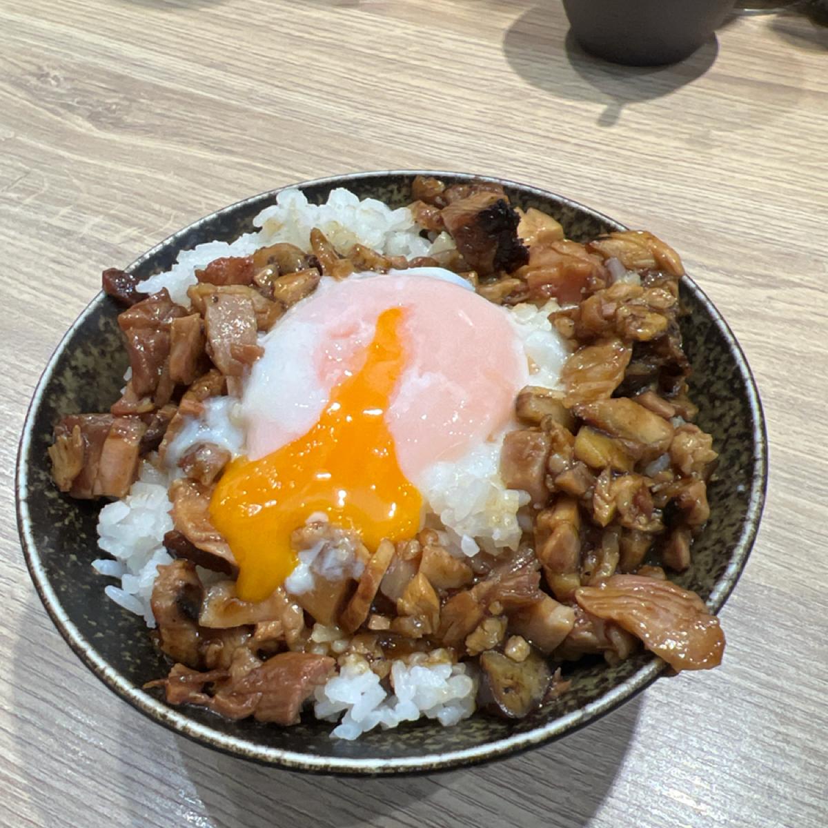 🍚温泉卵チャーシューご飯($80)は卵を混ぜるとまあまあでしたが、ご飯は少し湿っていました。