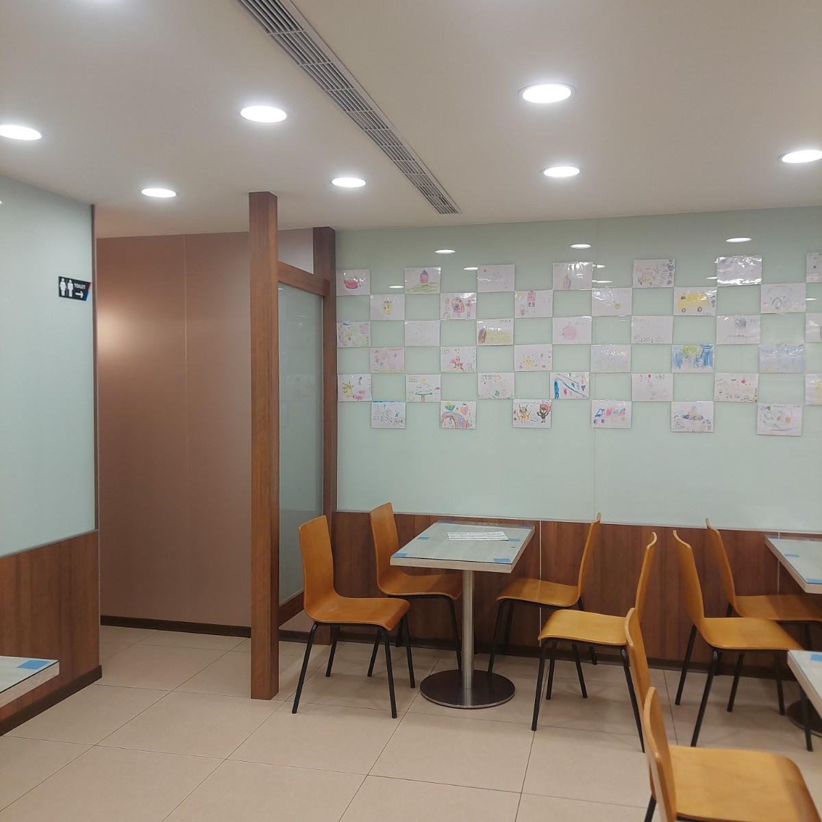 店内は広くて清潔感があり、壁には近隣の学校の子どもたちの作品が飾られていて、親近感が湧きます。
