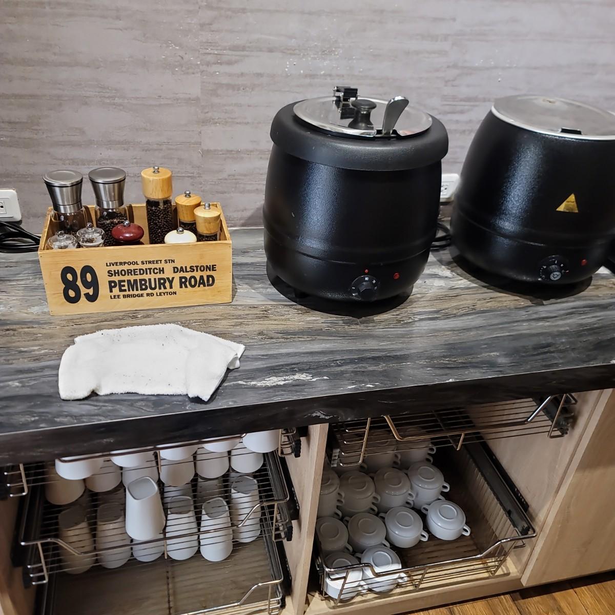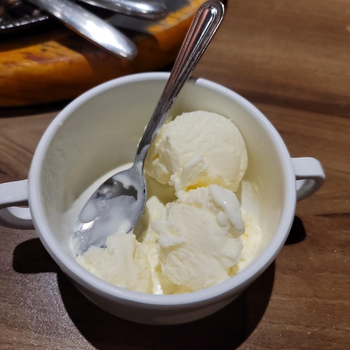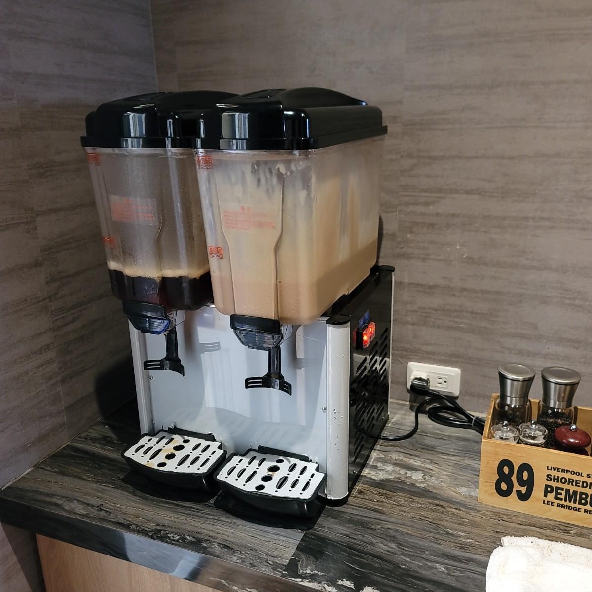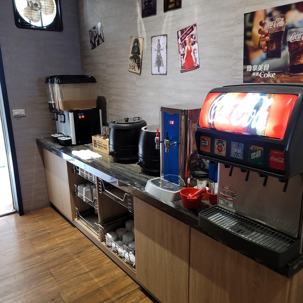 セルフサービスのバーでは、ソーダマシンのほかに、紅茶とミルクティーがあり、ミルクティーは濃いめでおいしいです。スープは具沢山で何杯でも食べられます。アイスクリームは平均的で、バニラ味とチョコレート味があり、開けると5分の8ほど入っているので、他の味が混ざることはありません。
