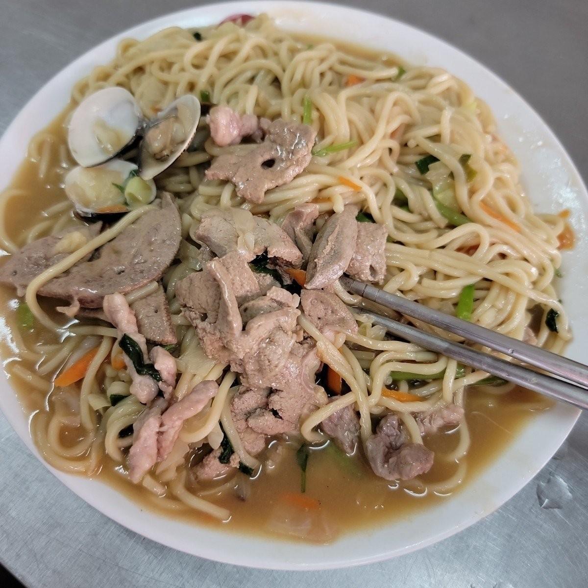 東門路にある伝統的なスナックバー。住所は路地にあるように見えますが、実際は東門路にあり、7-11の近くにあります。店内の商品は揚げ物が中心で、価格は6X~9X程度と非常にお手頃です。店内には女将さんしかおらず、注文してから調理してくれるので、人が多い時は少し待つことになりますが、待ちたくない場合は事前に電話予約をしておくと良いでしょう。豚細切り焼きそば、豚レバー入り焼きそば、アサリも入っていて、ボリューム満点です。女将さんは、この辺は工場か暴力団があり、みんなしっかり食べたいからと言って、たくさん分けてくれました。主張しすぎない味わいですが、伝統の技が詰まっています。細切り豚焼きそば、豚レバー焼きそば、エビチャーハンがおすすめです。