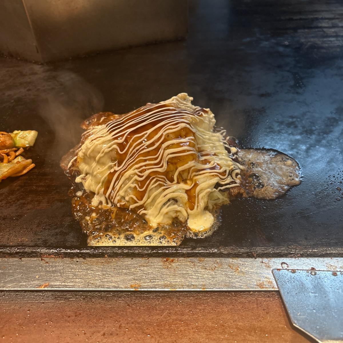 お好み焼きの上にこんもりとトマトとチーズと卵が乗っていて、マヨネーズをかけてもらいました🐷🍅