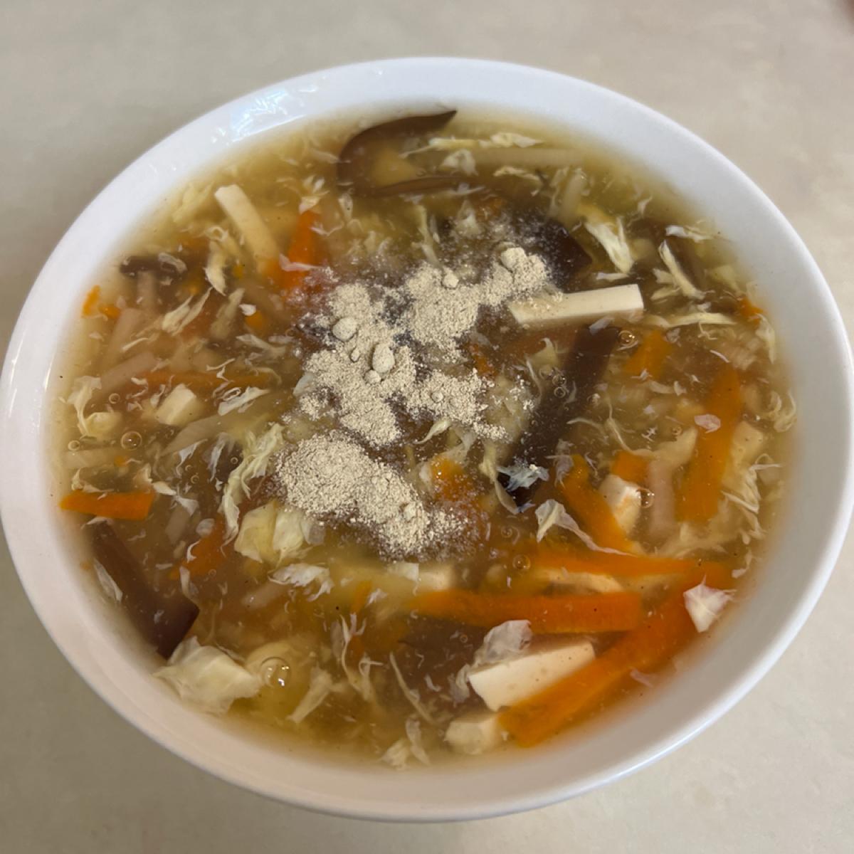 酸辣湯はやや甘めの味ですが、適度なとろみがあり、薄いあんがかかっていますが、濃すぎることはありません。滑らかに飲みやすいです。ブラックペッパーをたくさん加えると、より香りが引き立ちます。