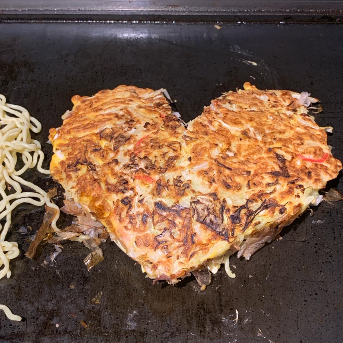 1品ずつ作って食べ終わってから次の料理を作るということしかできないので、3品目が完成するまでにすでに1時間かかっていました。最後の一品は広島焼きで、ベーコン豚をその場で焼き、焼きそばと卵液を合わせてハート型に仕上げます。完全に焦げた香りと複雑な味があり、個人的にはテキストを燃やすよりも好きです。