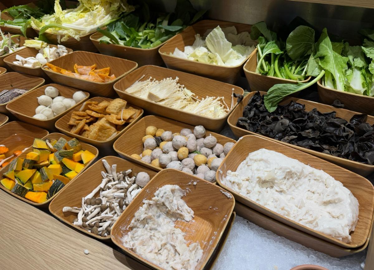 自助餐の野菜コーナーは選択肢がたくさんあり、約30種類のカラフルな野菜や火鍋材料が取り放題です。私は彼らのエビスライムやイカスライムが大好きで、超絶美味しいです。エビスライムはイカスライムよりも美味しく、中に完全に小エビが入っていて、肉がとてもふっくらしていて、香ばしくて最高です。