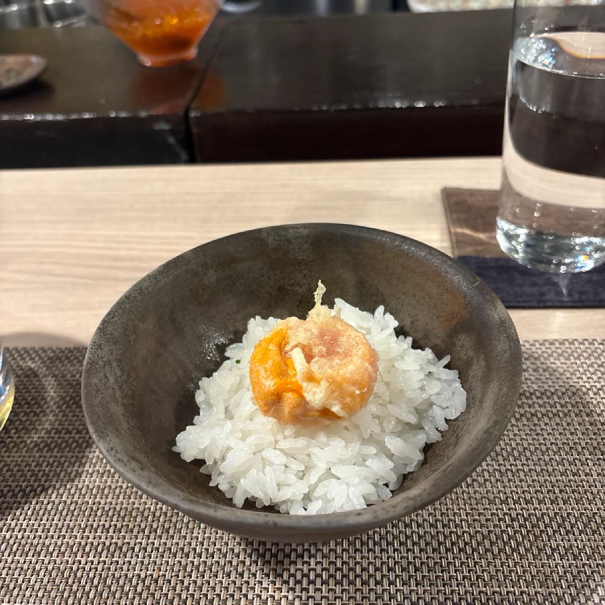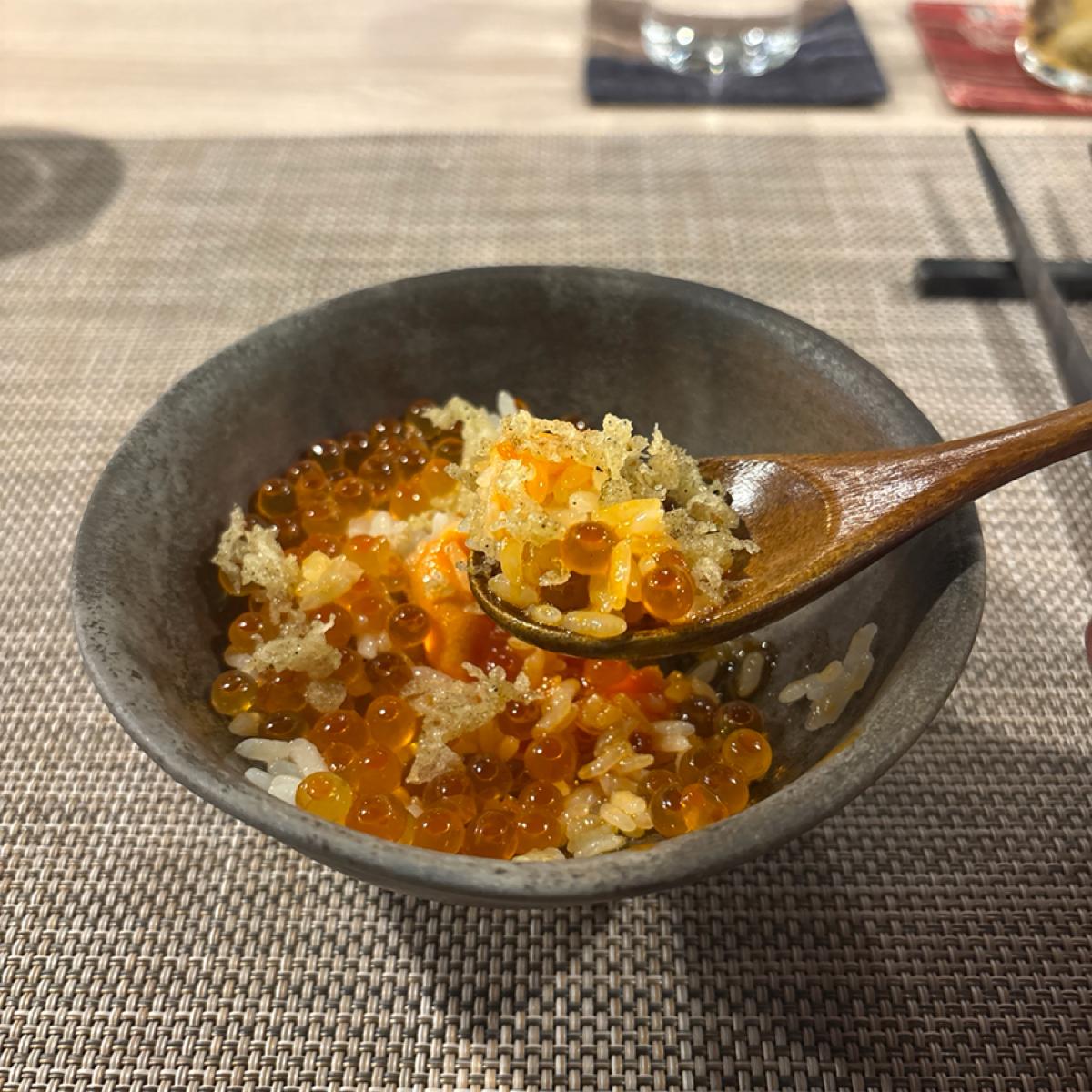 土鍋で炊いたつや姫に蘭王の天ぷらといくらを乗せて卵かけご飯にしました🍚🥚