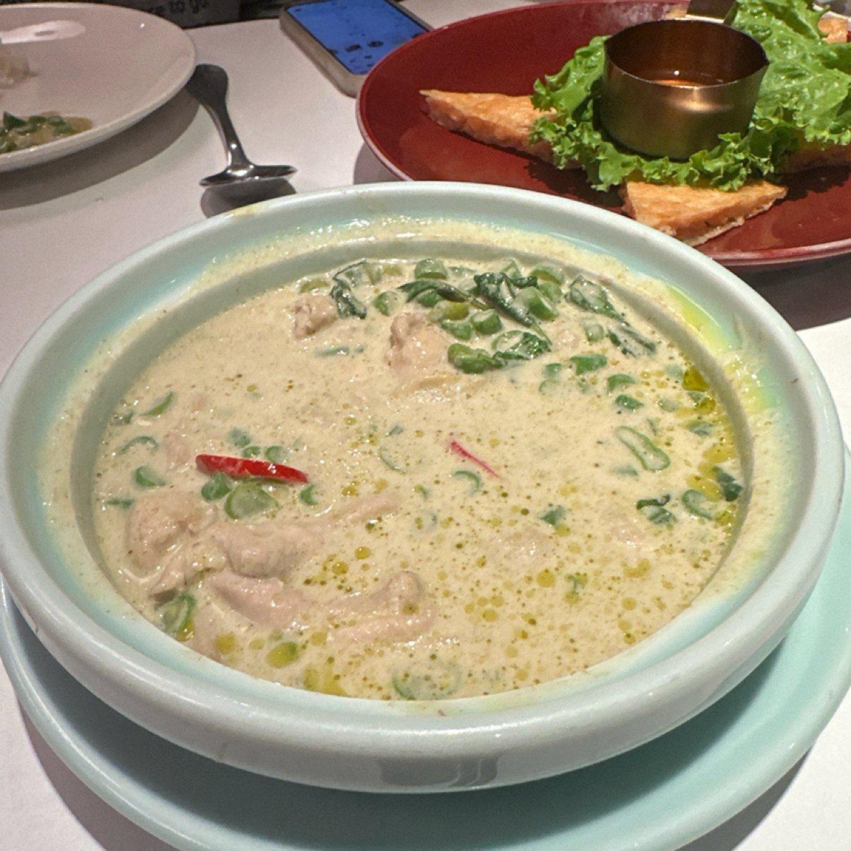 新鮮で柔らかい鶏もも肉を長豆と九層塔で味付けし、スパイシーで塩味が効いた香り豊かなグリーンカレーにタイ米をトッピングするととても食欲をそそります。