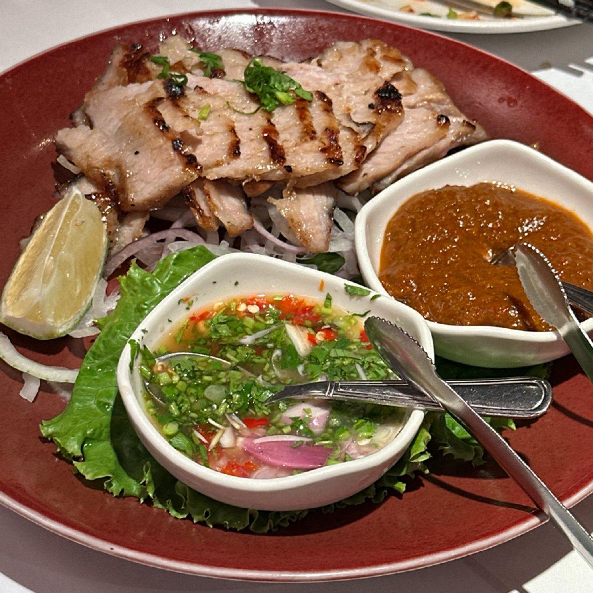 # 松阪豚 のスライスがたっぷり!そして、豚臭みがなく、柔らかくてサクサクした味わいで、お店特製のディップソースは比較的水っぽい甘酸っぱいレモン汁と、濃厚なタイ風BBQソースの2種類があり、どれも美味しいと思います。 。