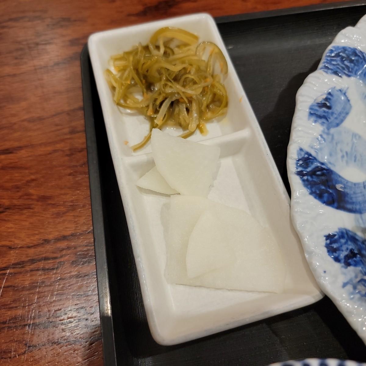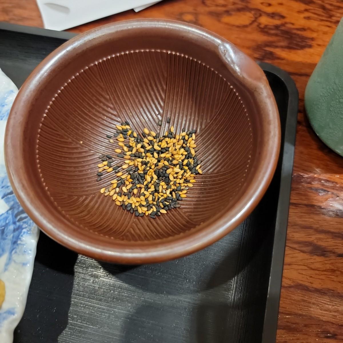 主食の肉は大体6つの小さな塊に切られており、一緒に高麗菜絲とスライスしたレモンが提供されます。また、すり鉢の中にはいくつかのごまがあり、すり潰してソースに加えて本格的な日本の豚カツの楽しみ方を体験できます。金色のサクサクの皮を噛むと、中の豚肉は非常に柔らかく、弾力があります。まず高麗菜絲を食べてから豚カツを食べると、油っこさを抑えることができ、しつこくありません。小菜の昆布芽と大根のスライスも非常にさっぱりしています;味噌汁には鶏肉も入っていて、とても美味しかったです。越光米はお米の王様にふさわしく、つい四杯もおかわりしてしまいました。