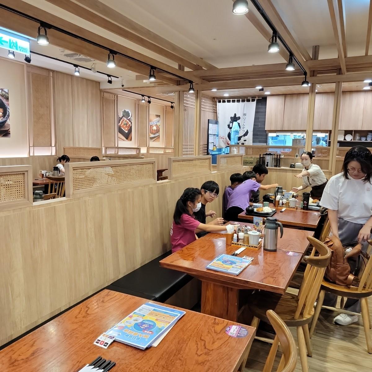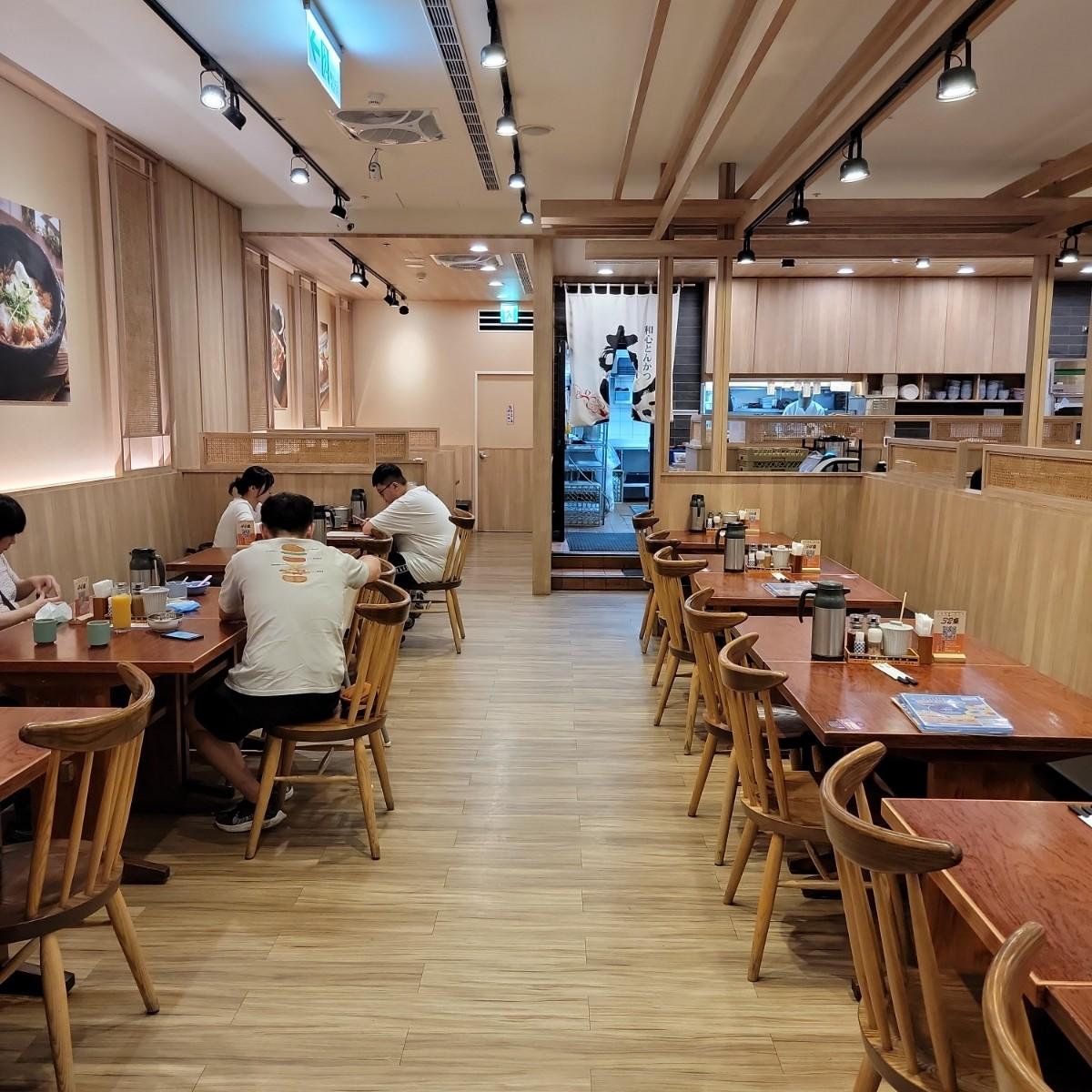 店内の空間は和風の木造スタイルで、暖色の照明が使われています。入り口にはいくつかの料理の模型が置いてあり、参考にできます。セットには味噌汁と小菜、越光米が含まれており、スープ、小菜、高麗菜絲、越光米は全て食べ放題です。ご飯は白米か黒米を選べます。