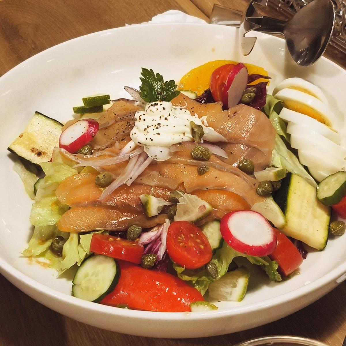 量が十分で、スモークサーモンは結構大きめで約7.8枚、サラダはレタス、ナッツ、レーズン、紫玉ねぎ、トマト、ゆで卵、小きゅうりが入っていて、ドレッシングがちょうどよかったです