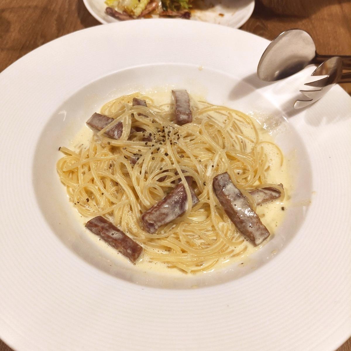 クリーミーで美味しく、麺はちょうど良い食感、ベーコンはしっかりした味わいがありましたが、2人にはちょっと少なかったです