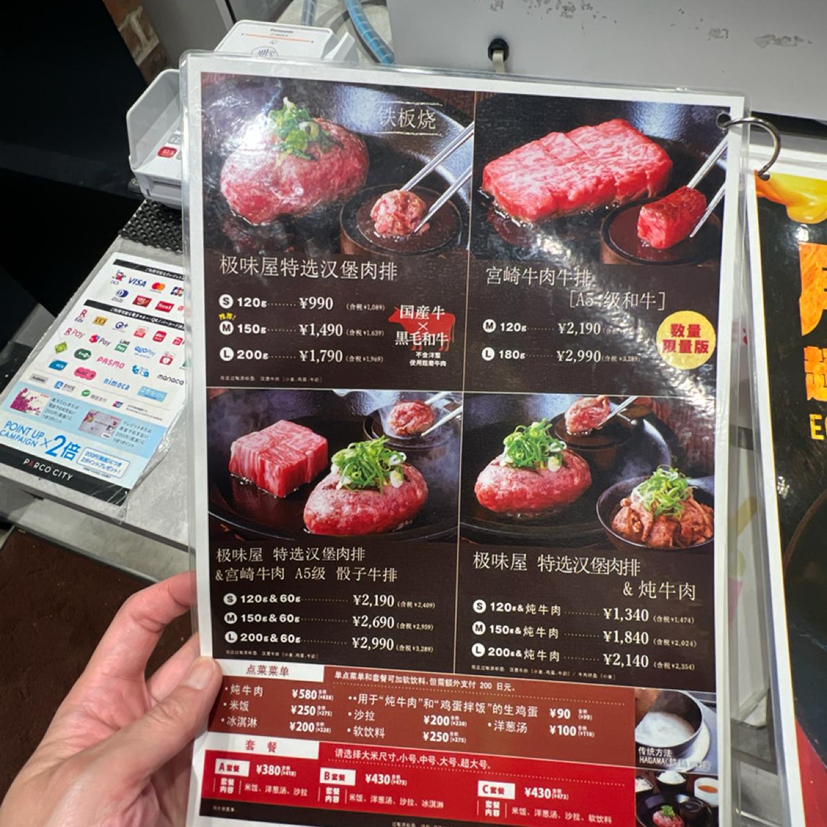 今回沖縄のPARCO CITY商業施設に行った際、美食街にある「極味や 沖縄パルコシティ店」に立ち寄りました。こちらは牛肉料理をメインにした専門店で、特に牛肉のハンバーグが目を引きました。