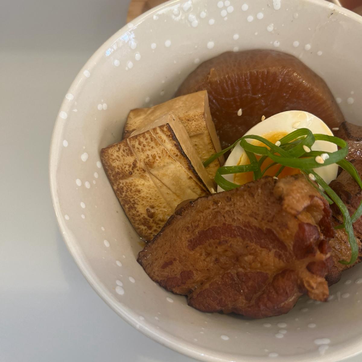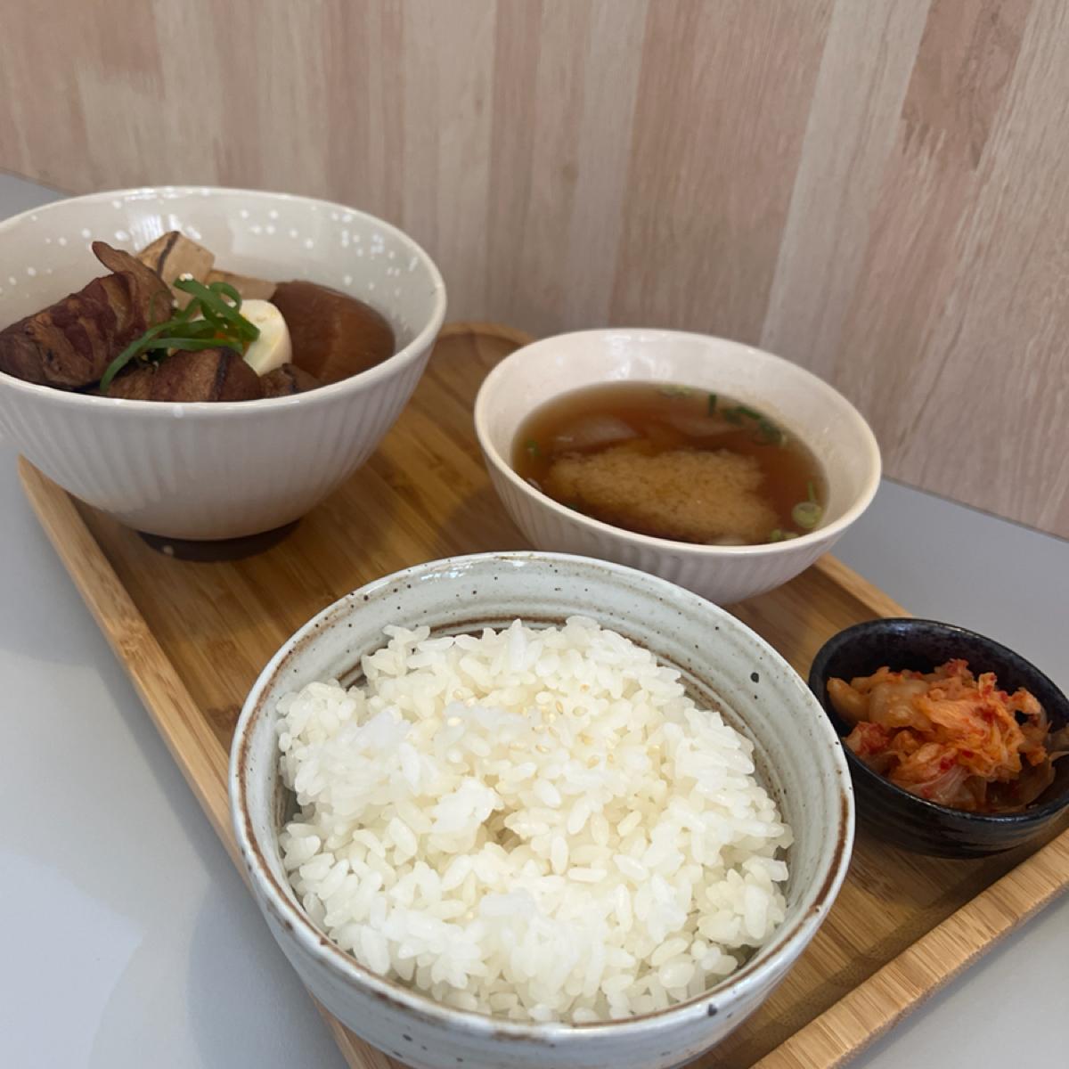 じっくり煮込んだ中国産とうもろこしコーナー(180):キムチ小皿、ご飯、味噌汁が付きます。キムチは、ほんのり辛くて少し酸味があり、疲労回復に役立つ和風漬物です。味噌汁は塩辛すぎないので、塩分が苦手な方でも大丈夫です。主食の角煮は東坡豚に似ており、東坡豚、大根、半熟卵、平豆腐が入っています。ソースは香り豊かで、少ししょっぱくてほんのり甘いです。お肉は柔らかく、それぞれの素材の味がしっかりと残っており、マリネもとても美味しいです。