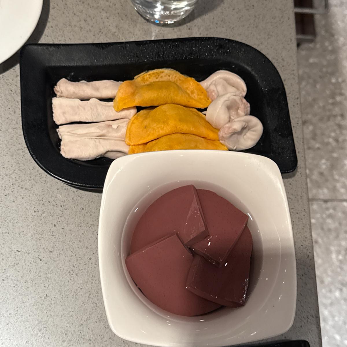 トッピングでは、エビ団子のパフォーマンスが優れていて、弾力があり新鮮です;バサ魚は肉質が柔らかく、スープの味が染み込むことでより甘みを感じます;鴨の血は予想通り柔らかく、臭みがなく、麻辣鍋の魂の組み合わせです;卵餃子はクラシックな火鍋の材料で、特に目を引くわけではありませんが、スープで煮ると馴染みのある温かみが増します。