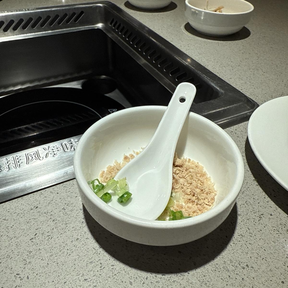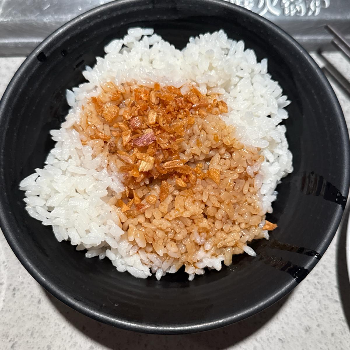 主食は友人と一緒に豚脂の混ぜご飯を頼みました。白ご飯に豚脂と醤油をかけて、香りが漂い、シンプルながらとても美味しいです。濃厚なスープと豊富な火鍋材料とも相性抜群で、飽きが来ずご飯が進みます。