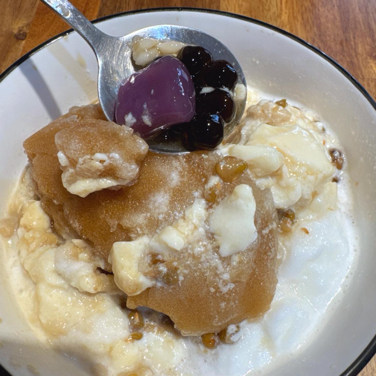今日は黒糖粉粿、タピオカ、紫芋団子、緑豆をトッピングでお願いしました😙 紫芋団子とタピオカは非常に弾力があり、Softすぎないです👍
