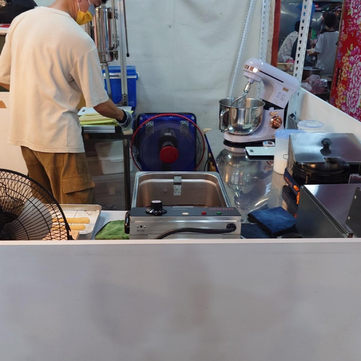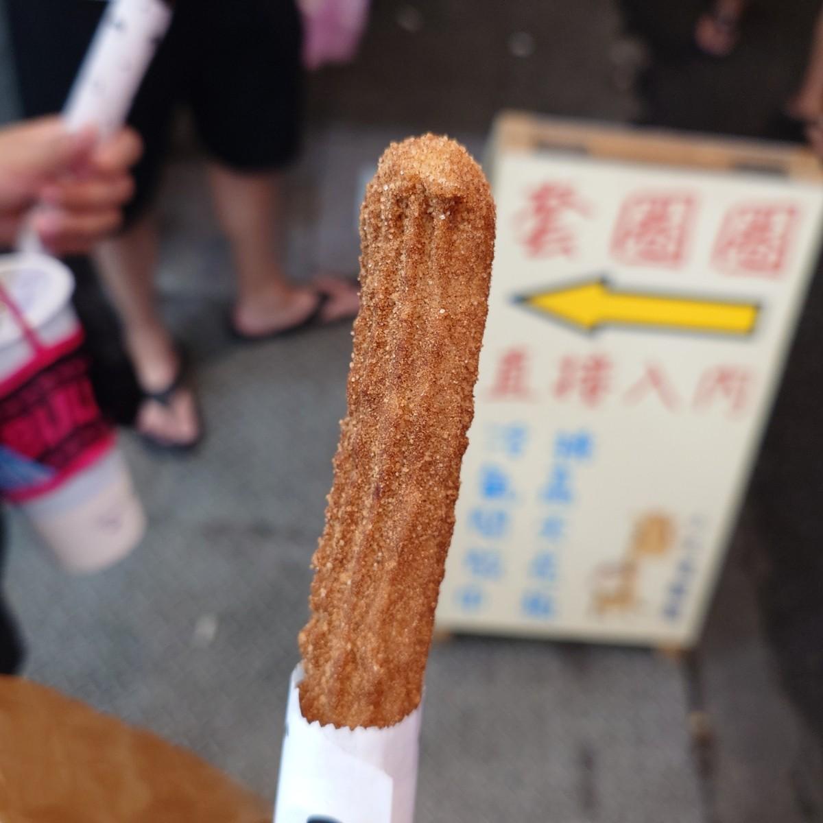 後ろに成形機があって、生地をチュロスの形に押し出してから、油で揚げます。(これは白糖粿と似ていますが、白糖粿の餅は手作りです。)