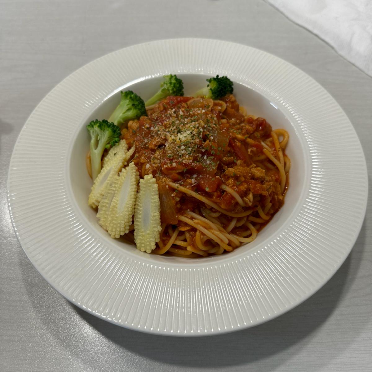 今回はトマトミートソースのスパゲッティを食べました。ミートソースはかなり塩っぱいので、無糖の緑茶と一緒に食べるとちょうどよかったです。ドリンクの甘さや氷の量は調整でき、麺の量も増やすことができます。 . QRコードを使ってご注文ください。
