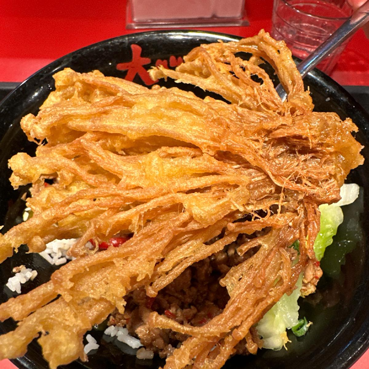 豚の炒め物はご飯との相性が抜群で、白いご飯が食欲をそそります。シャキシャキのキュウリと合わせて、脂っこくなくて、半熟卵とえのき炒めがちょうどいいです。えのきのフライは、外はカリカリ、中はぷりぷりの皮がえのきそのもののみずみずしさを包み込み、とても美味しいです。