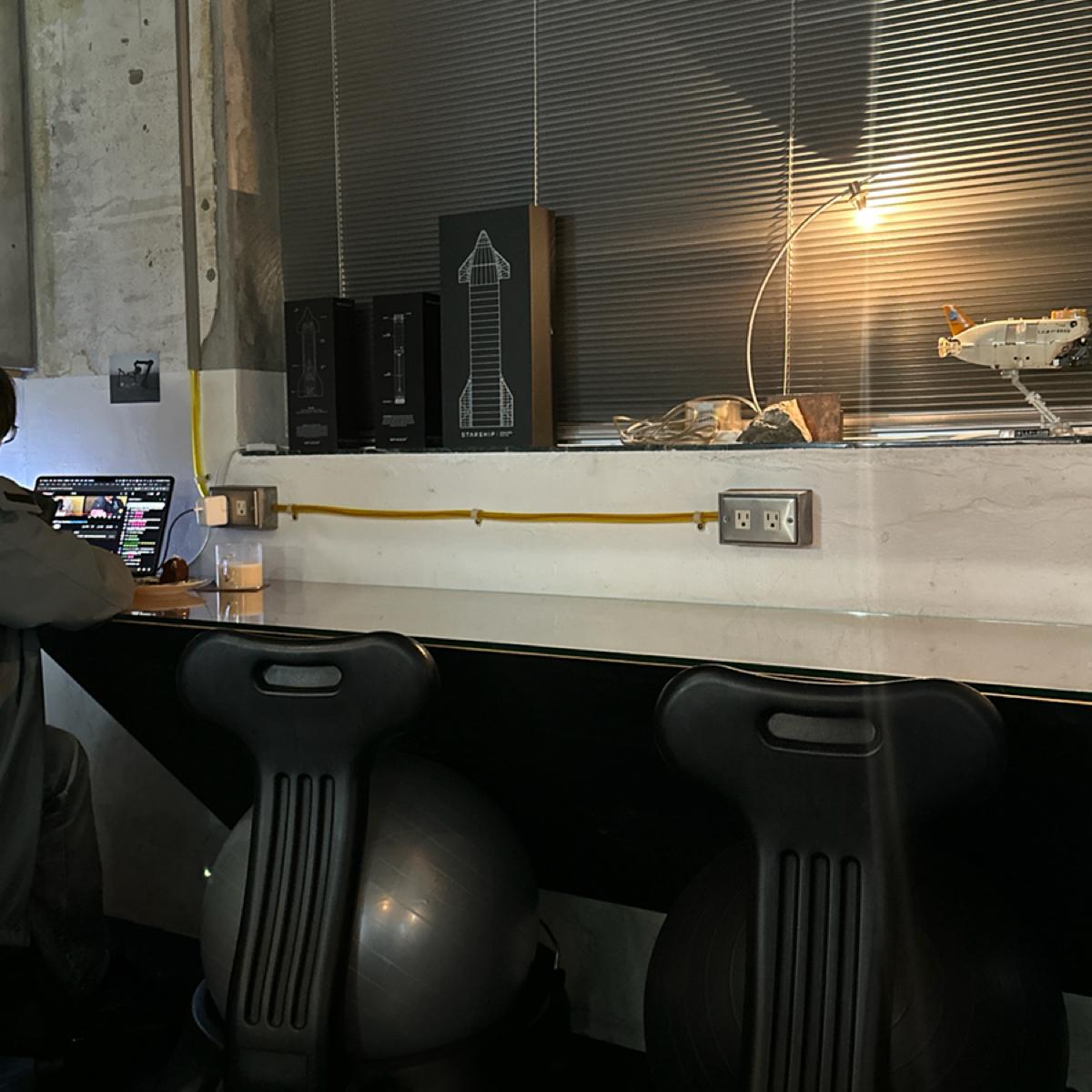 座席エリアはあまり多くないがとても面白い、ヨガボールを使った椅子もある