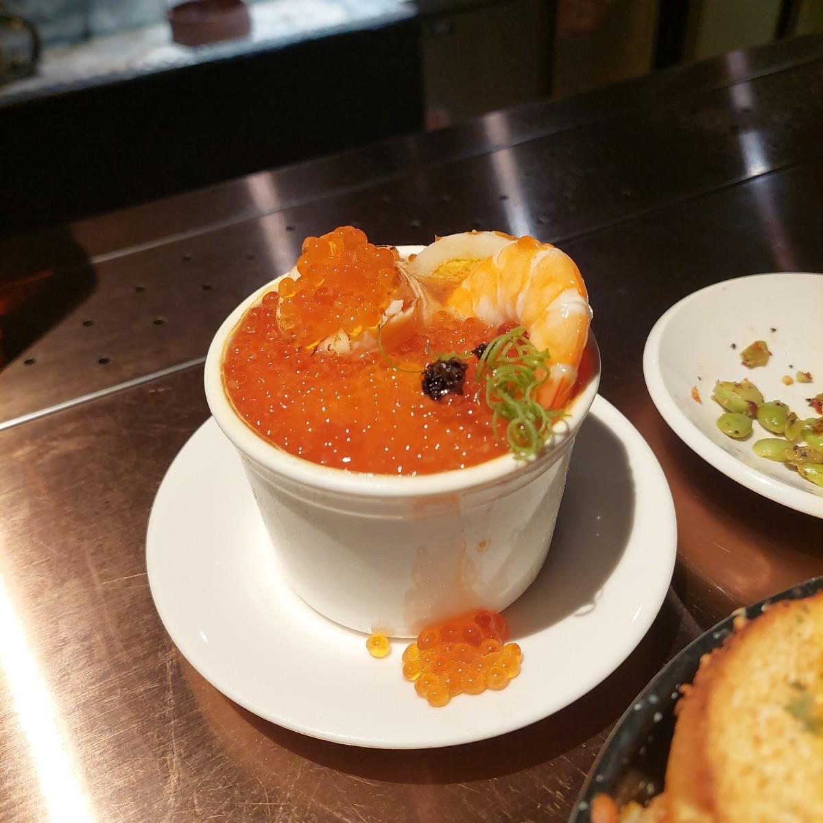 上のイクラは冷たいですが、下の蒸し卵は焼きたての温度なので、あまり大きくてそのまま飲み込むと火傷します。