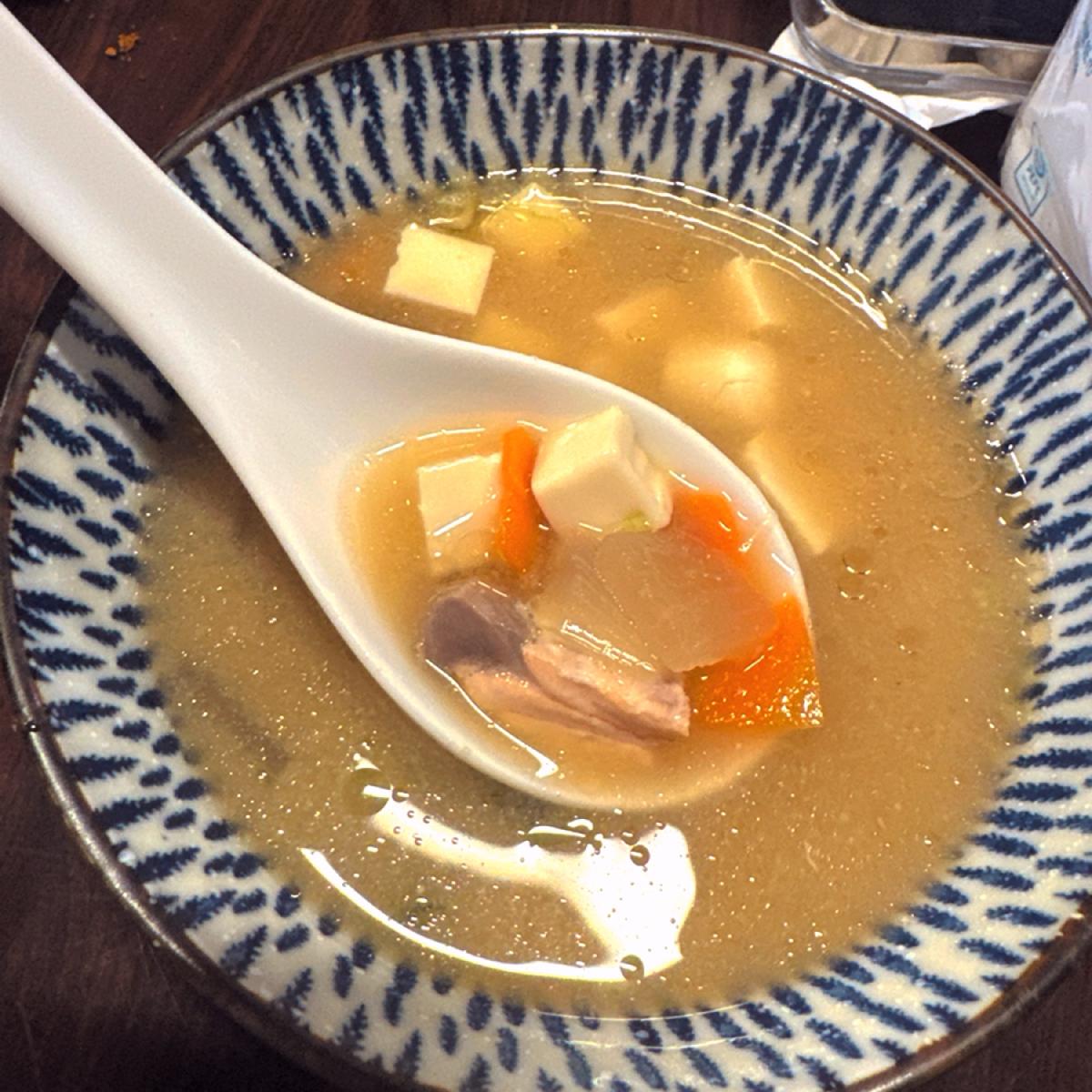 鮮魚味噌汁🍲スープの中には鮭の肉、豆腐、ニンジン
