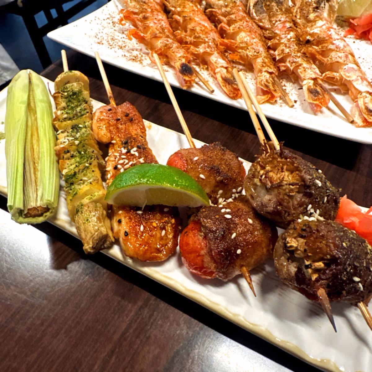 .豚肉のえのき包み、ベーコンのミニトマト包み、鶏肉の串、あんこうの串、皮付きコーン